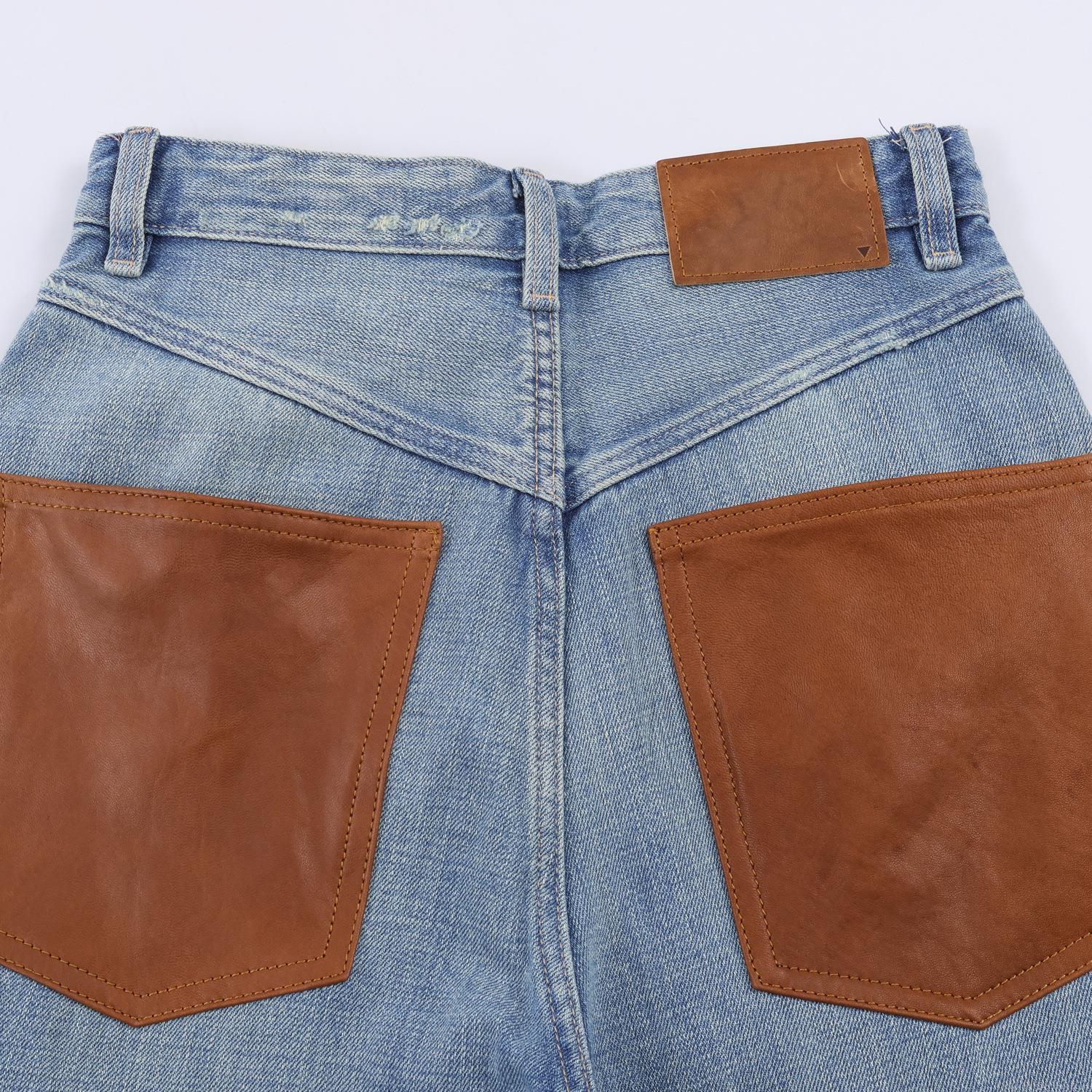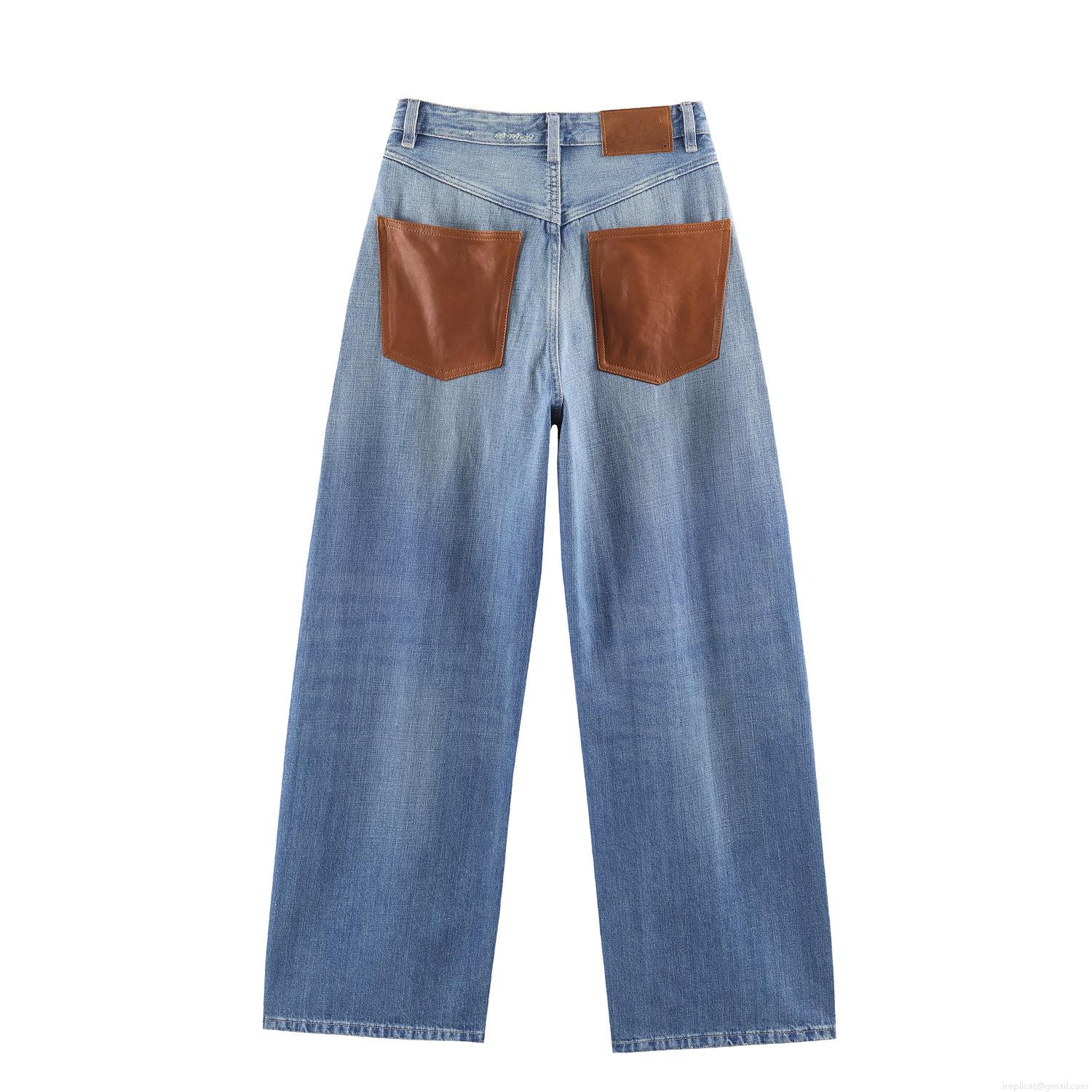 • American Vintage High Waisted Wide Leg Jeans Women Washed Denim Straight Trousers With Brown Leather Pockets Streetwear Loose Fit Drape Long Pants