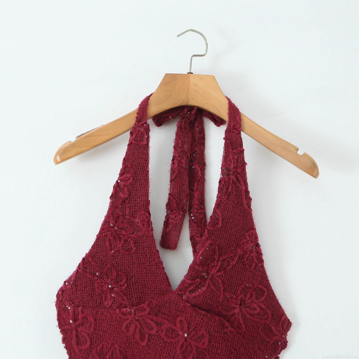 • Burgundy Halter Mesh Sequin Mini Dress With Floral Lace Backless Slim Fit Sleeveless Sexy Clubwear Party Dress For Women New Spring Fashion