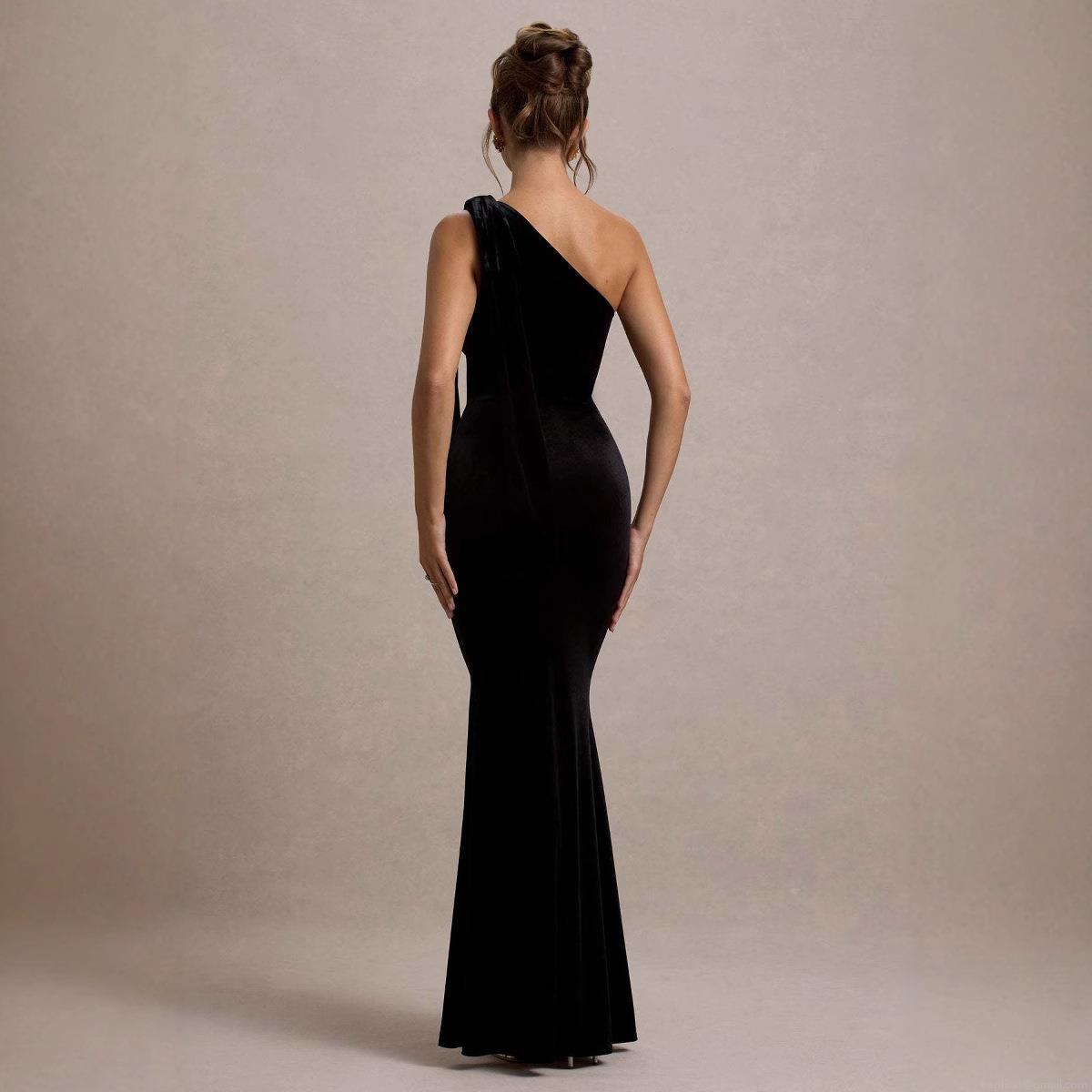 • Elegant Black Velvet One Shoulder Mermaid Evening Dress Women Sexy Slim Fit Floor Length Maxi Party Gown With Bow Decoration
