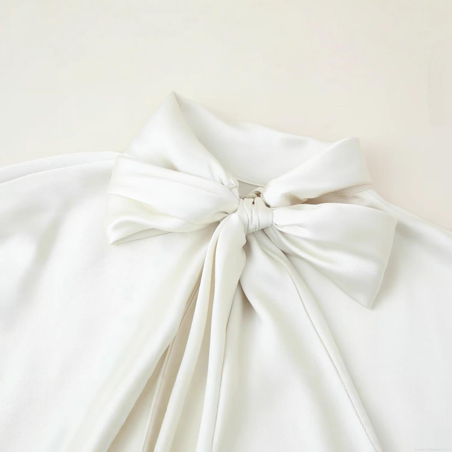 Elegant Ivory White Satin Mini Dress for Women Long Sleeve Bow Tie Cowl Neck Ruched Bodycon Party Evening Dress Luxury Silk Feel Socialite Short Dress