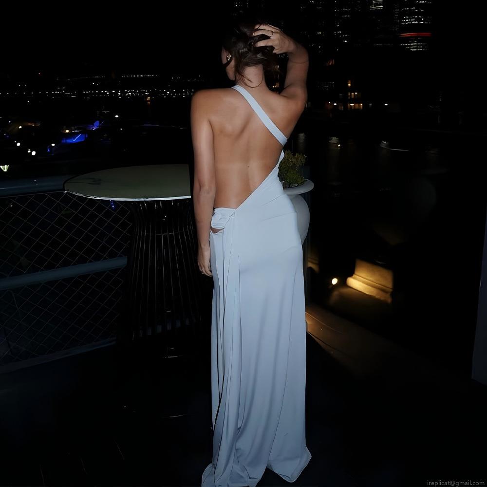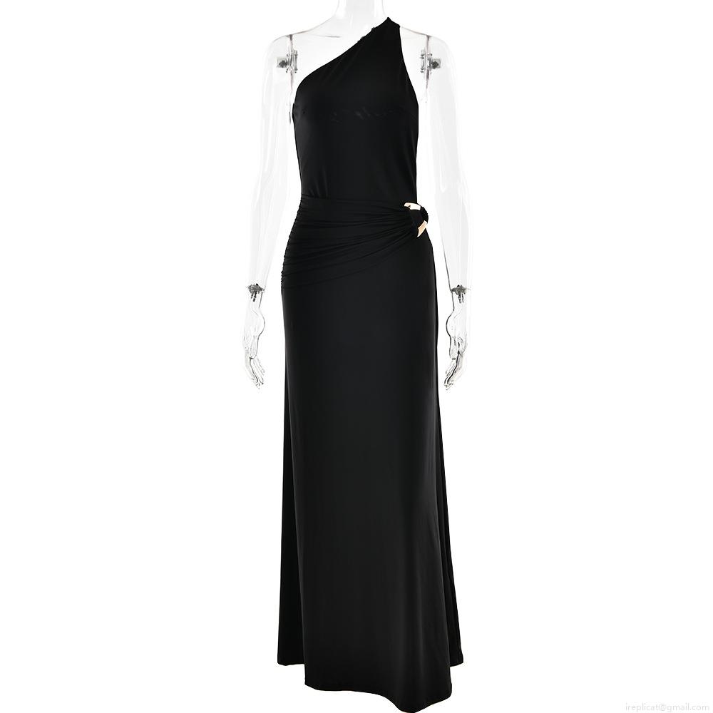• Elegant One Shoulder Maxi Dress Backless Pleated Evening Party Long Dress With Metal Buckle Women Sexy Slim Fit Polyester Solid Color Gown