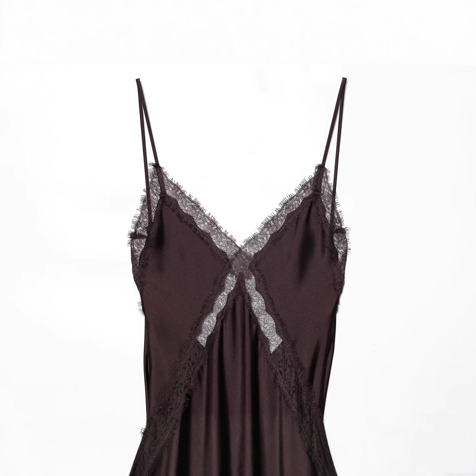 • Elegant Satin Lace Midi Dress V-Neck Spaghetti Strap Backless Party Evening Gown For Women Chocolate Brown Silk-Like Patchwork Formal Dress