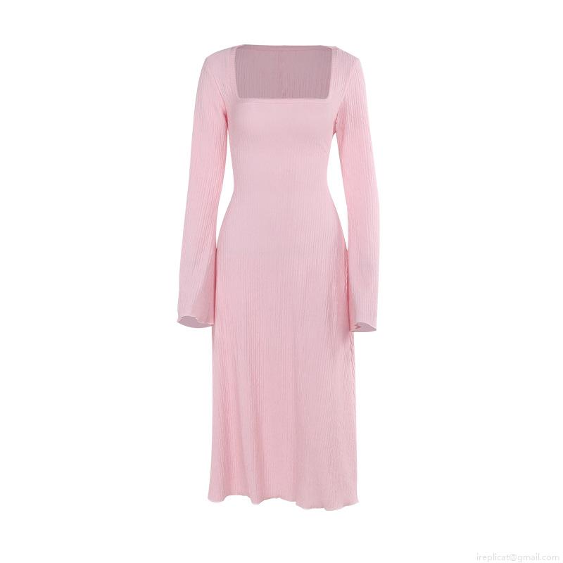 • Elegant Women Long Sleeve Square Neck Side Split Maxi Dress Polyester Spandex Rippled Texture Slim Fit Lace-Up Solid Color Party Dress