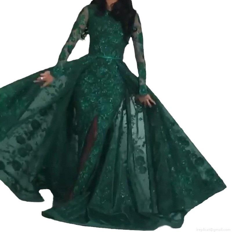 • Emerald Green Long Sleeve Sequined Lace Evening Dress Sexy Floral Embroidery High Slit Maxi Dress Elegant Women Formal Party Gown For Wedding Prom