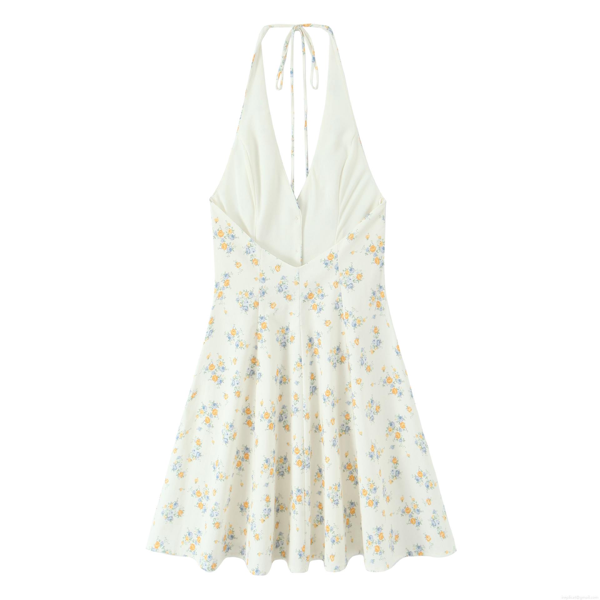 • Floral Print Halter Dress Deep V-Neck Backless Polyester Mini Dress For Women Elegant Summer Vacation Party Dress With Front Buttons