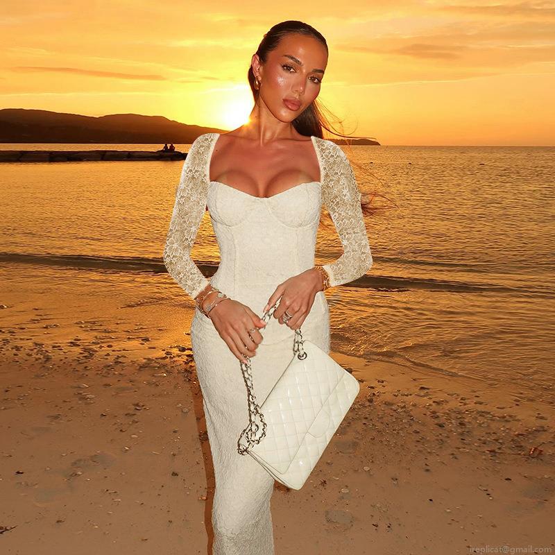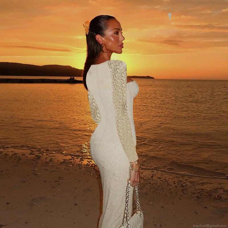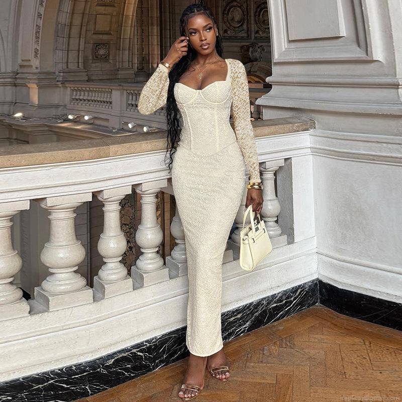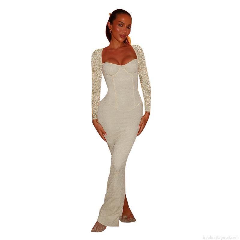 • French Retro Lace Long Sleeve Maxi Dress Slim Fit Square Neck Elegant Mermaid Bodycon Evening Party Wedding Guest Dress For Women