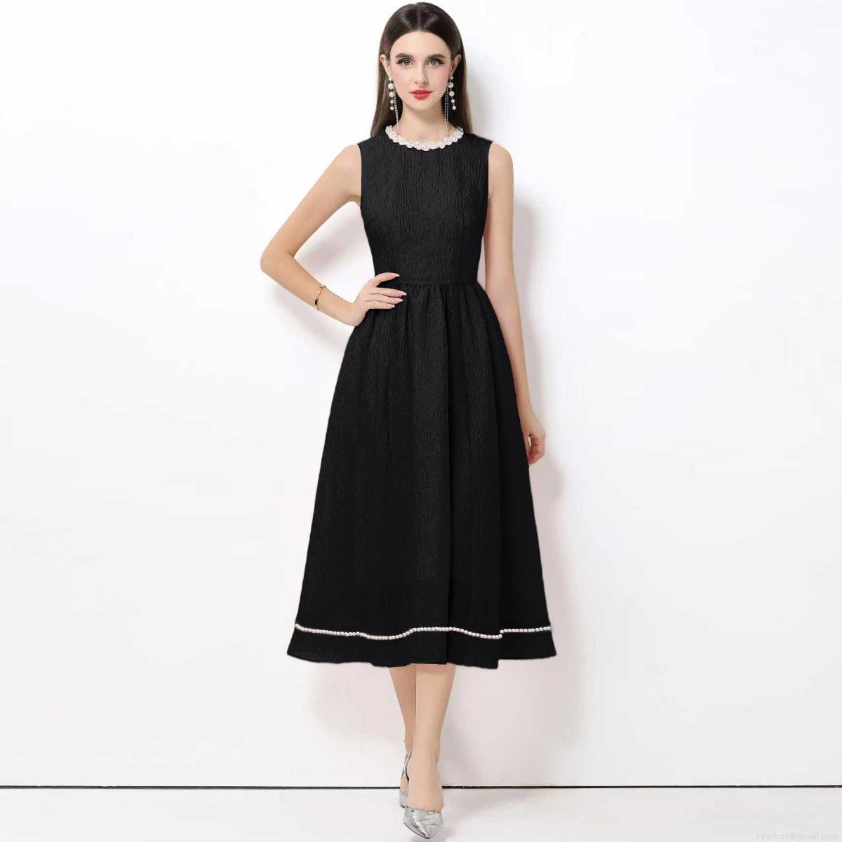 • French Vintage Black Sleeveless Midi Dress With Pearl Trim 100% Polyester Elegant Slim Fit A-Line Evening Party Dress For Women