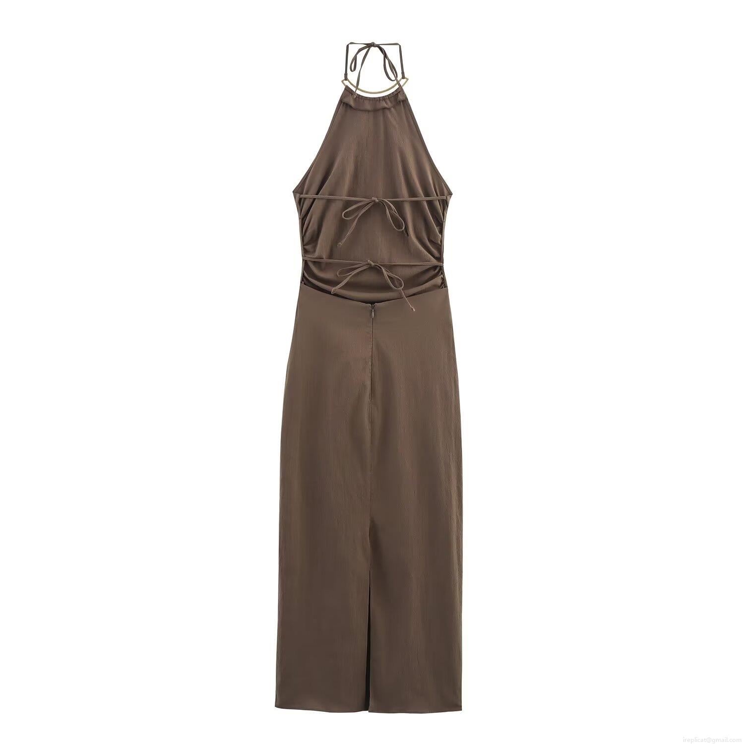 • Halter Neck Midi Dress Women Sexy Backless Lace-Up Splicing Metal Ring Detail Slim Fit Brown Summer Dress Street Chic Party Vacation Apparel