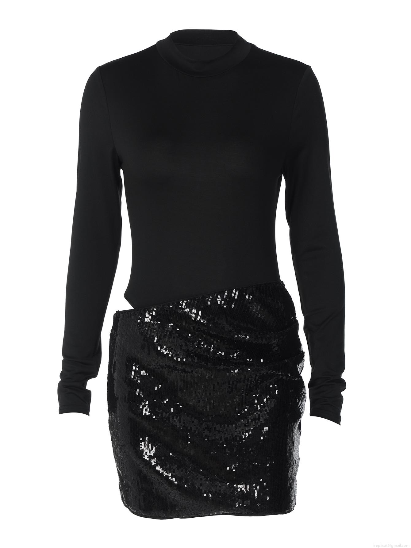 • Sexy Black Long Sleeve Cut Out Bodycon Mini Dress For Women Fashion Sequin Stitching Round Neck Slim Fit Party Club Evening Dress