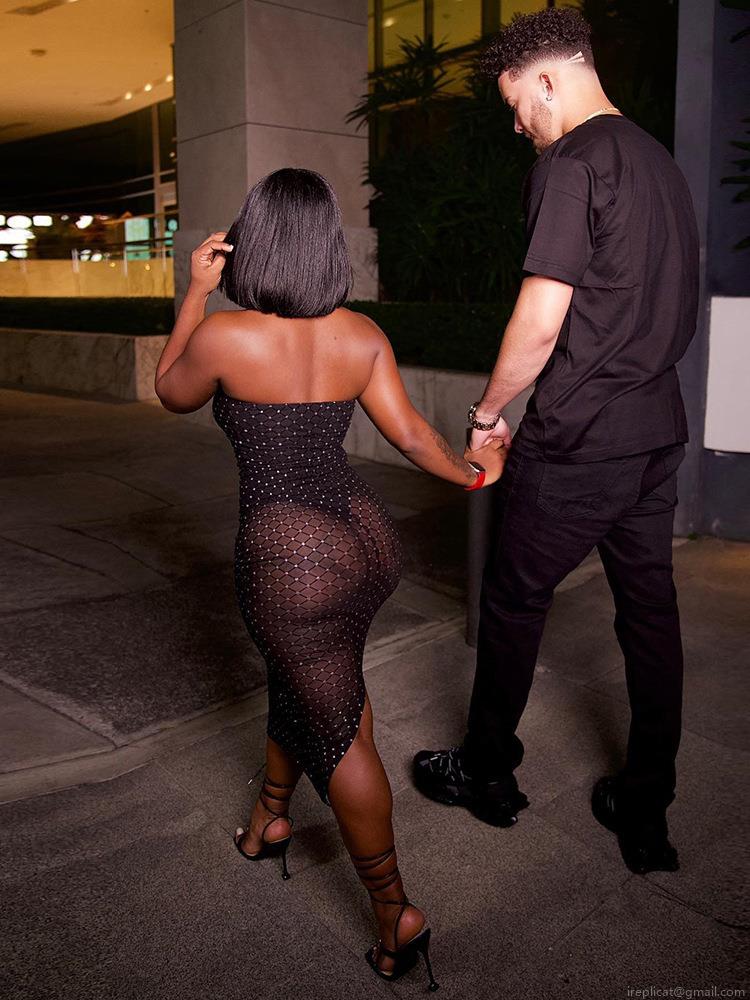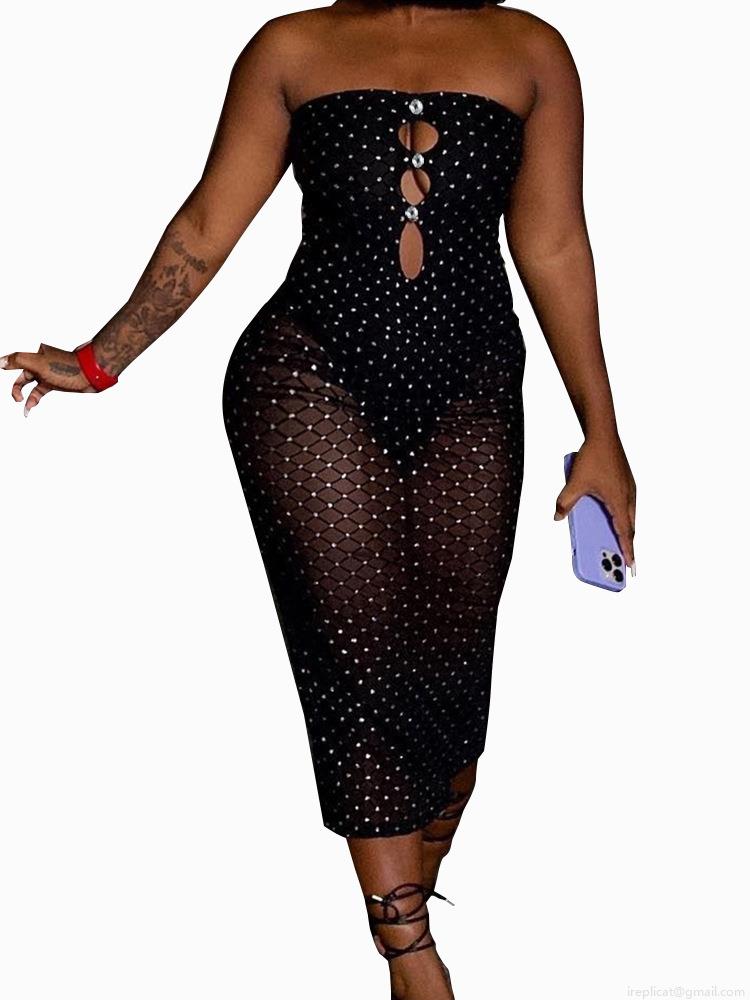 • Sexy Black Rhinestone Mesh Cutout Dress For Women Off Shoulder Bodycon Midi Nightclub Party Dress Silver Stamping Flocking Elegant Evening Gown