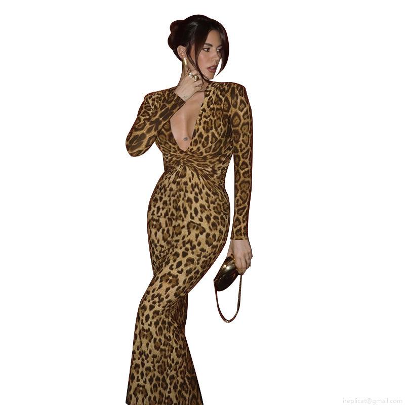 • Sexy Leopard Print Deep V-Neck Long Sleeve Maxi Dress For Women Elegant Twist Knot Slim Fit High Waist Party Evening Long Dress