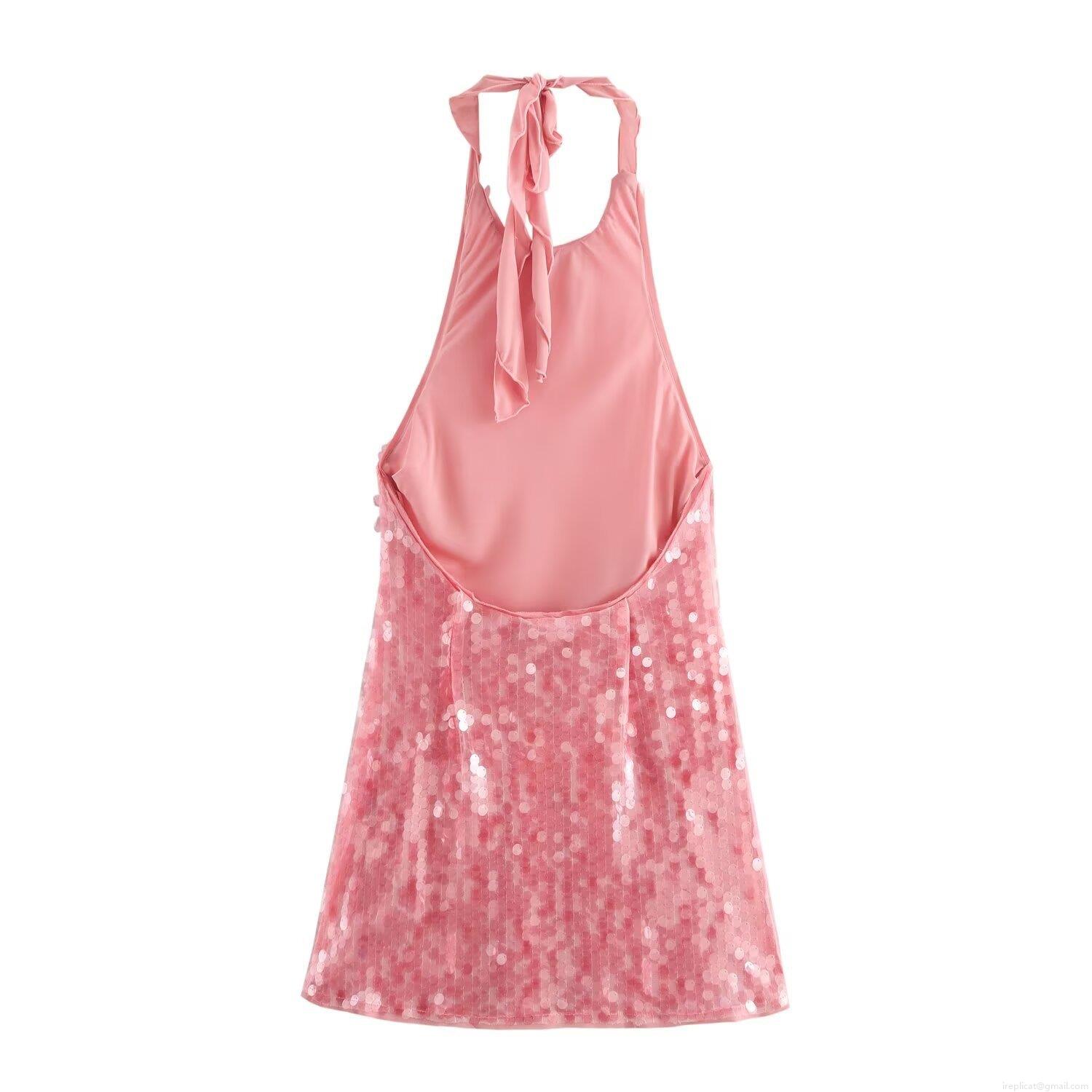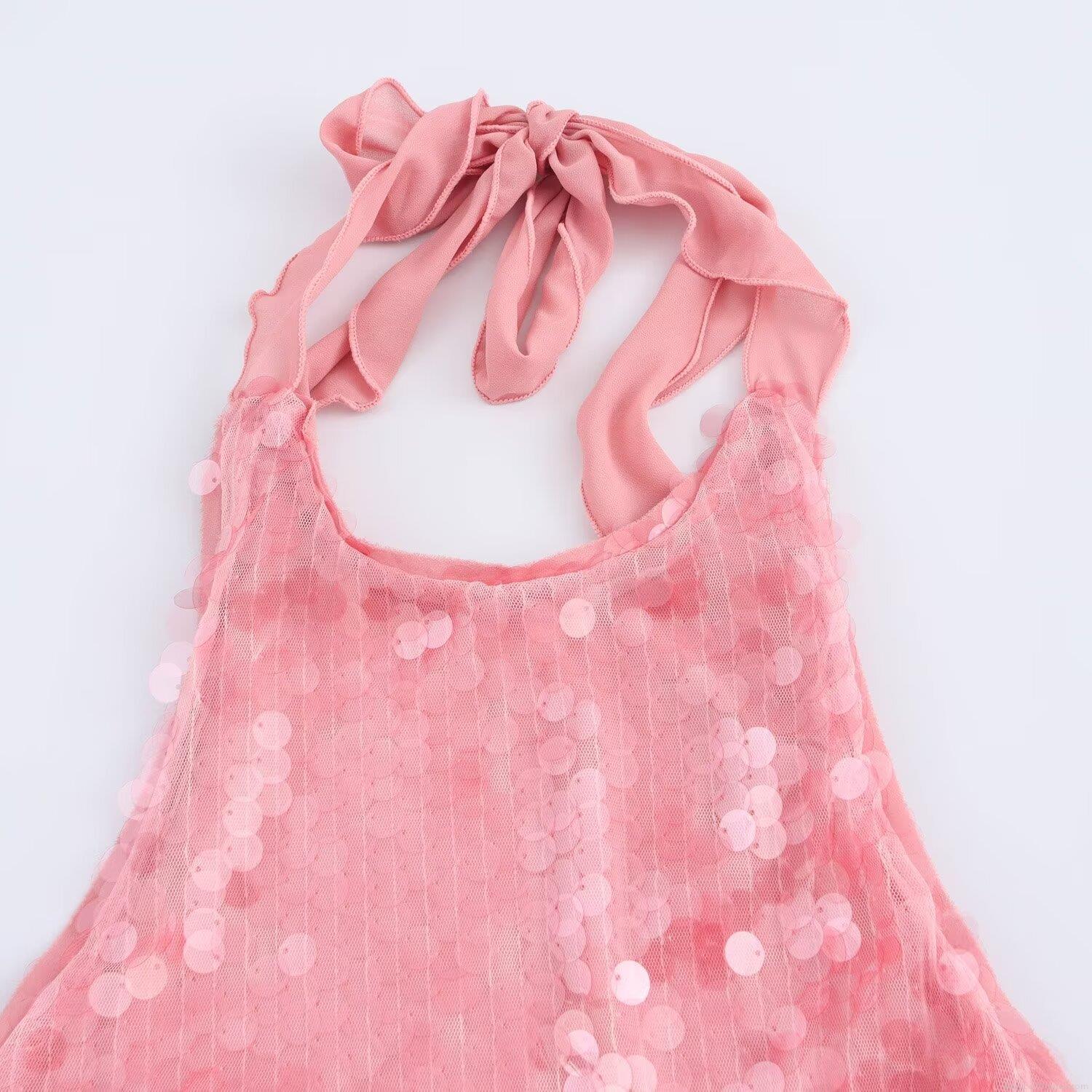 • Sexy Pink Sequined Halter Dress Backless Mini Party Dress For Women Clubwear Evening Gown Sparkly Sleeveless High Waist Short Dress