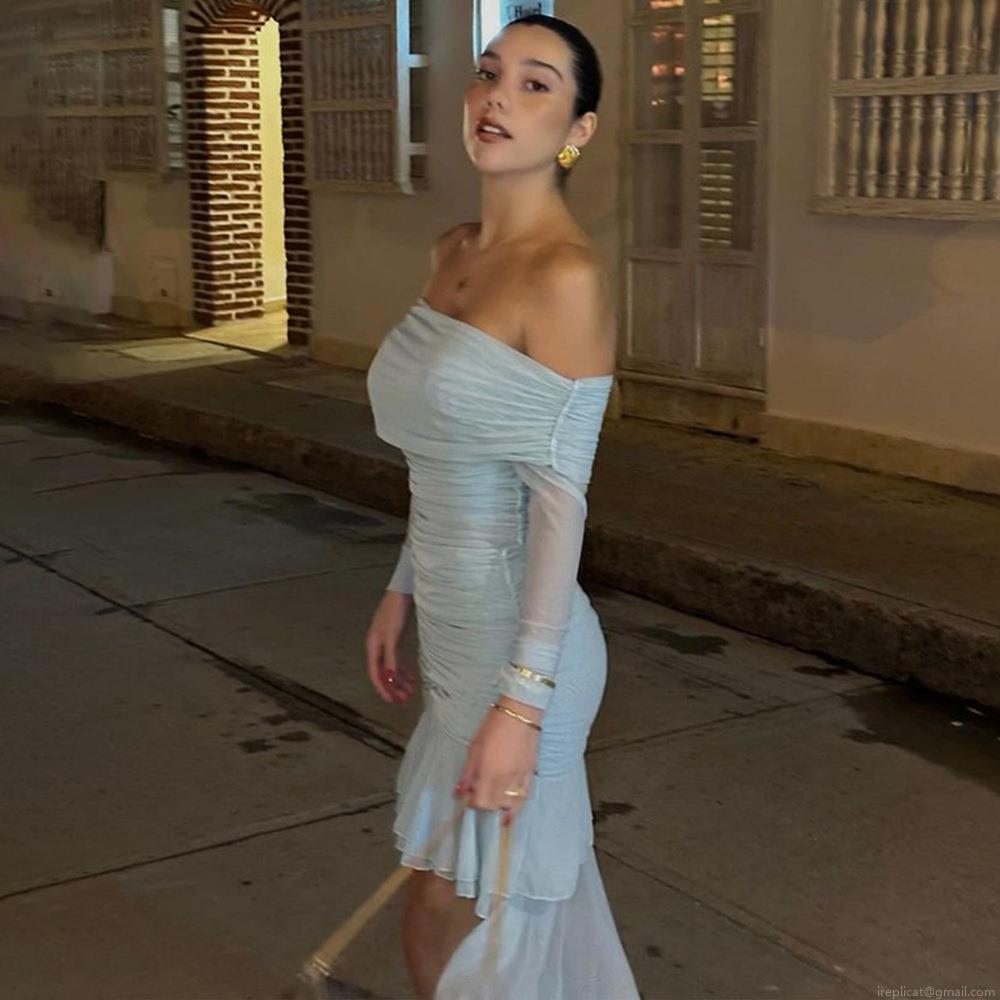 Solid Color, Splice, Ruffles, Gathering, Irregular Hem, Off-the-shoulder Neckline, Sheer Mesh