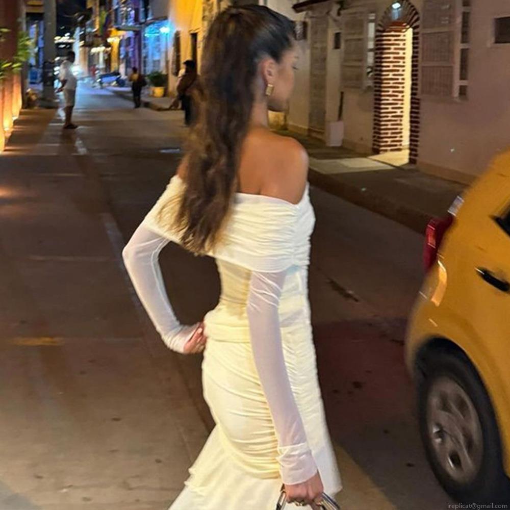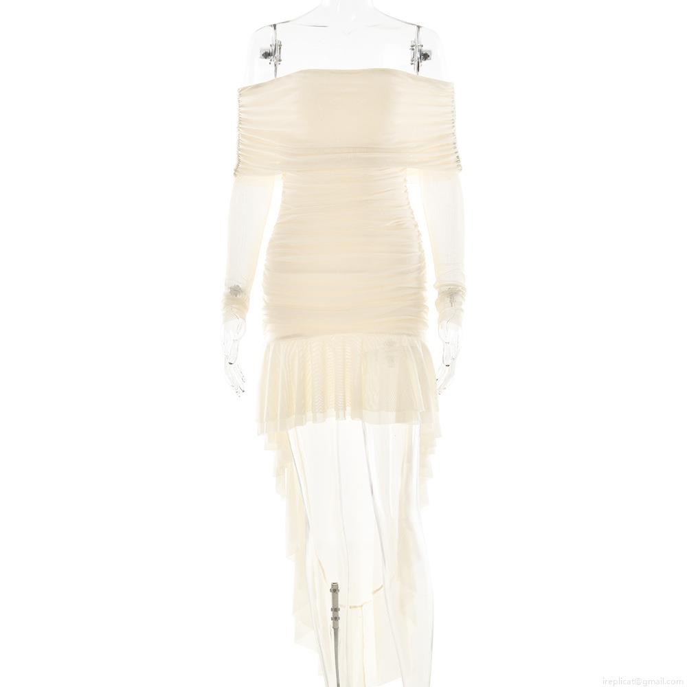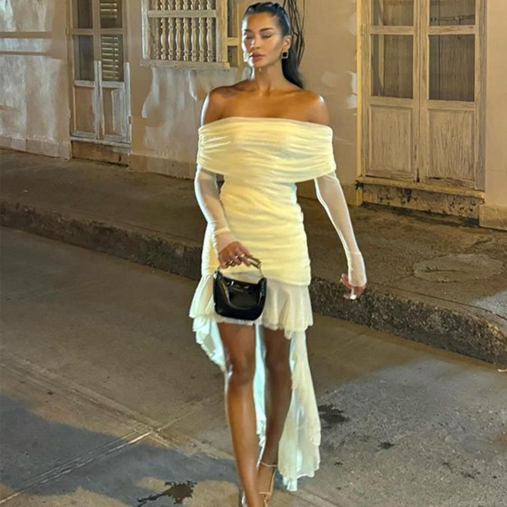 • Sexy Ruched Mesh Dress Off The Shoulder Sheer Long Sleeve Asymmetrical Ruffle Hem Women's Party Cocktail Evening Bodycon Dress Elegant Solid Color Spliced Gauze Slim Fit Fish Tail Mini Gown For Club Wedding Night Out Autumn Winter Fashion