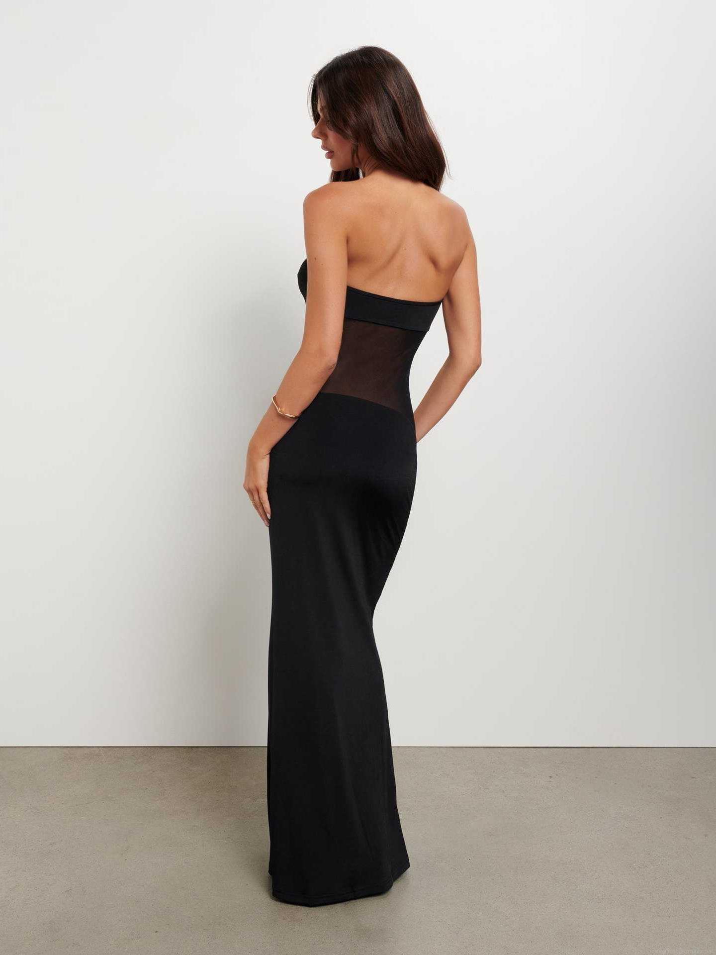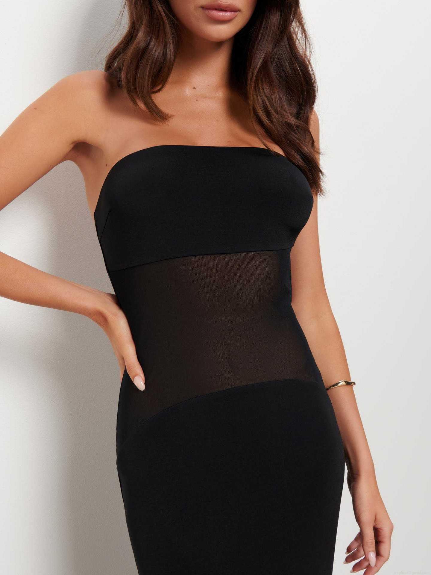 • Sexy Strapless Mesh Splicing See Through Bodycon Maxi Dress For Women Summer Evening Party Elegant Solid Black Clubwear Sleeveless Long Dress