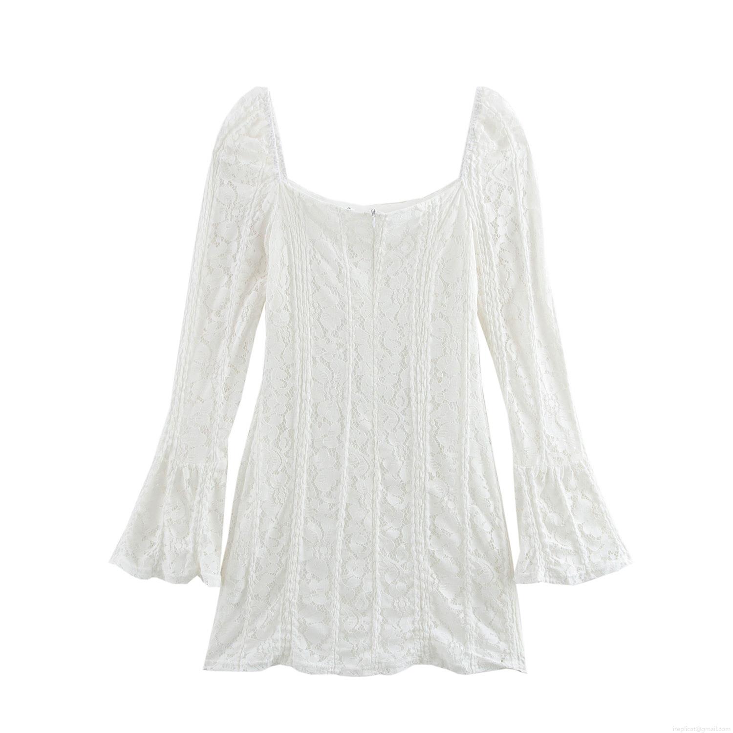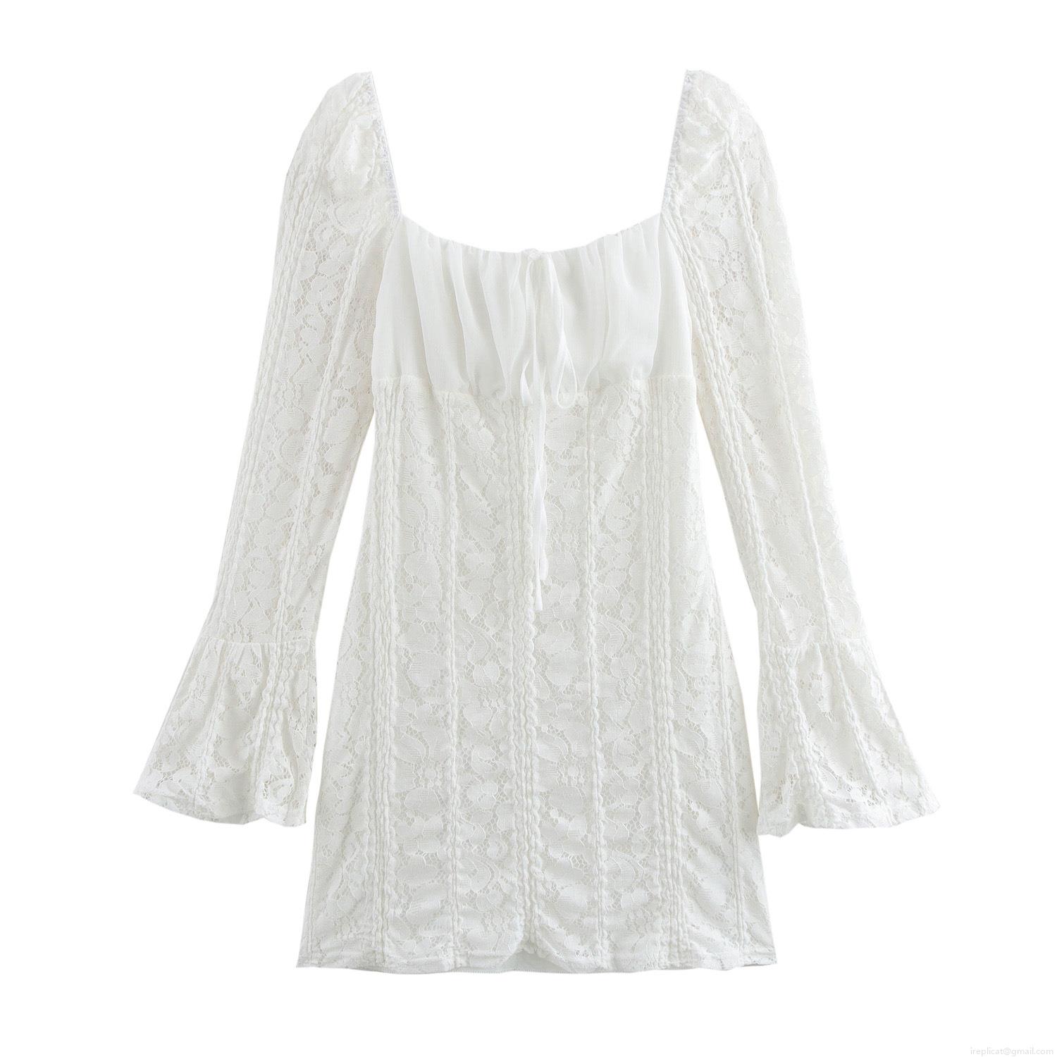 • Sexy White Lace Mini Dress For Women Elegant Square Neck Flare Long Sleeve Slim Fit A-Line Short Dress With Drawstring Front Party Clubwear