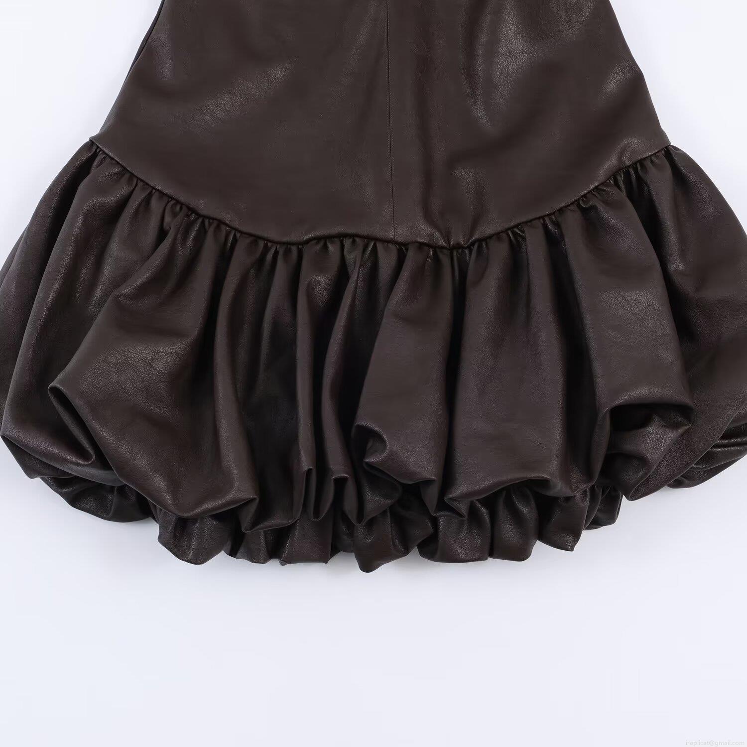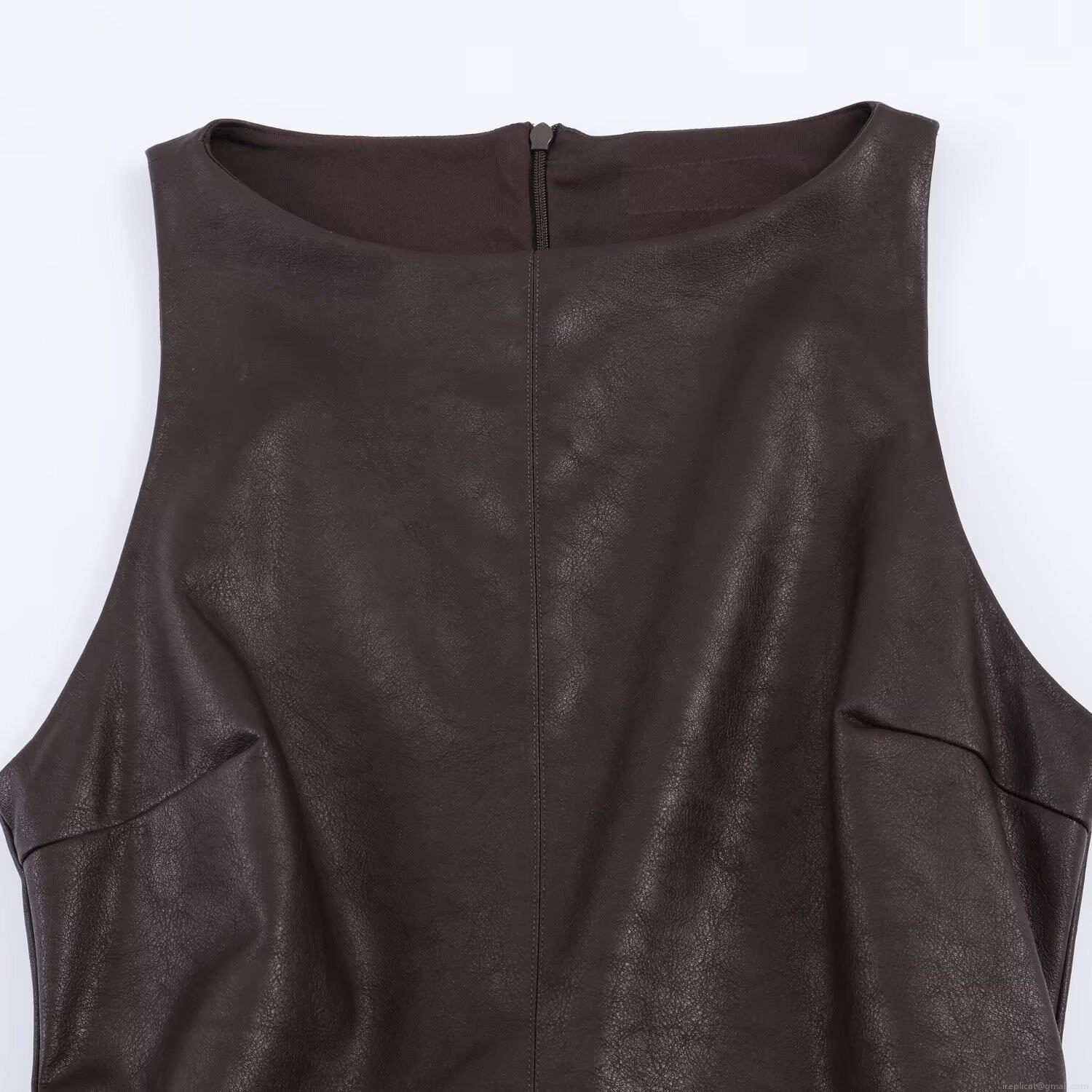 • Summer Women Sleeveless PU Leather Mini Romper Dress Round Neck Pleated Bubble Skirt Slim Fit Sexy Party Club Short Dress Dark Brown