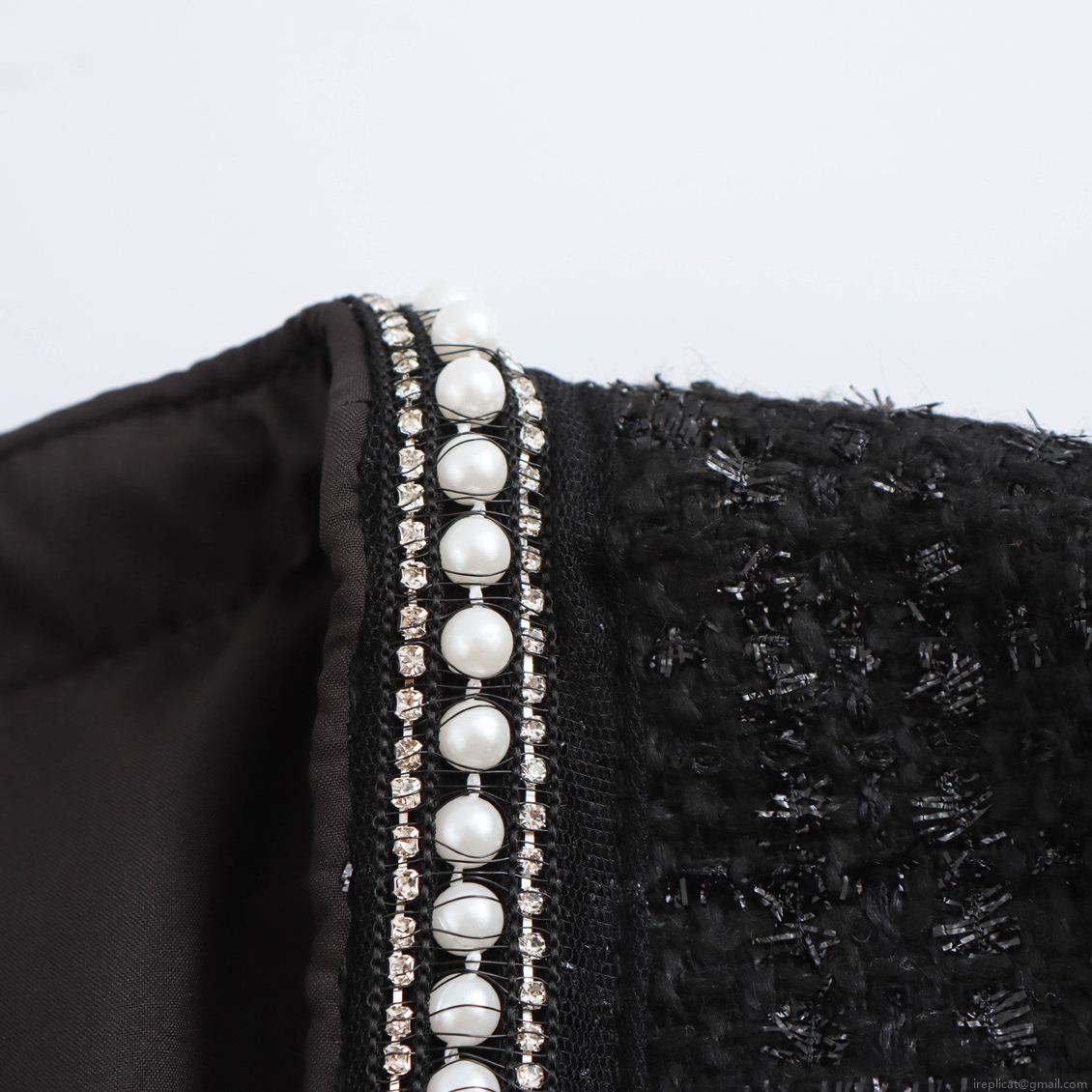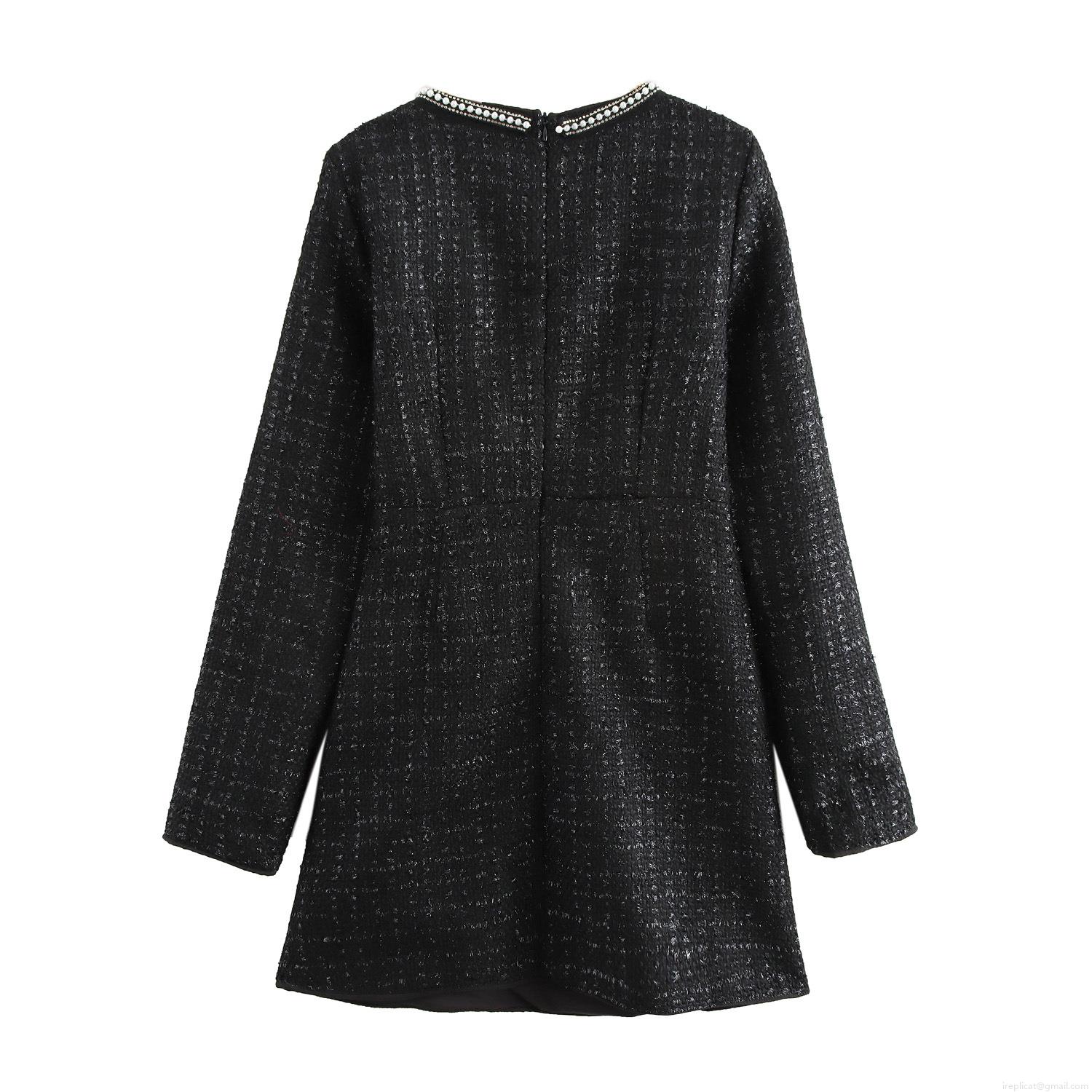 • Women Elegant Chanel Style Tweed Mini Dress Square Neck Pearl Rhinestone Trim Long Sleeve A-Line Short Dress For Banquet Party Socialite Lady