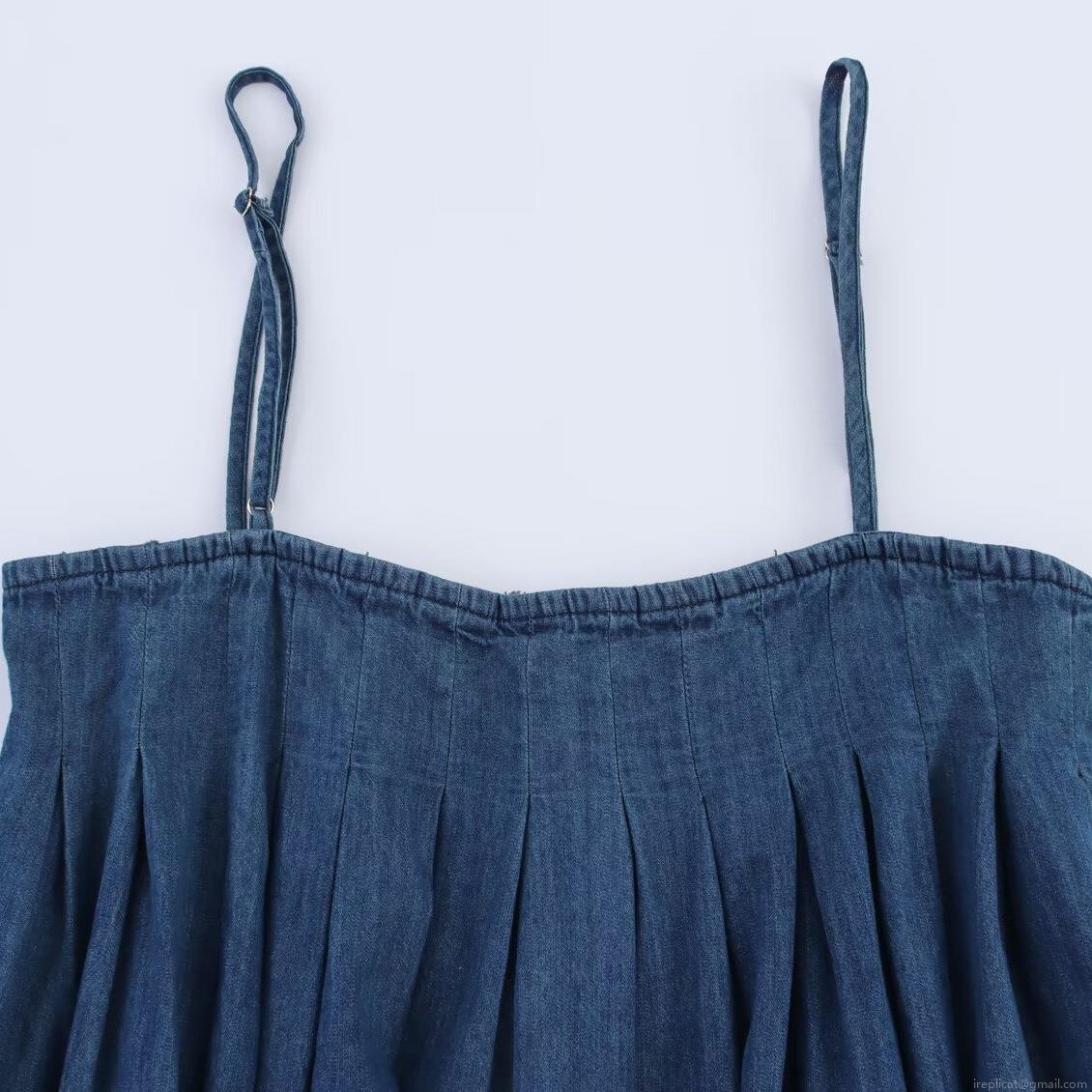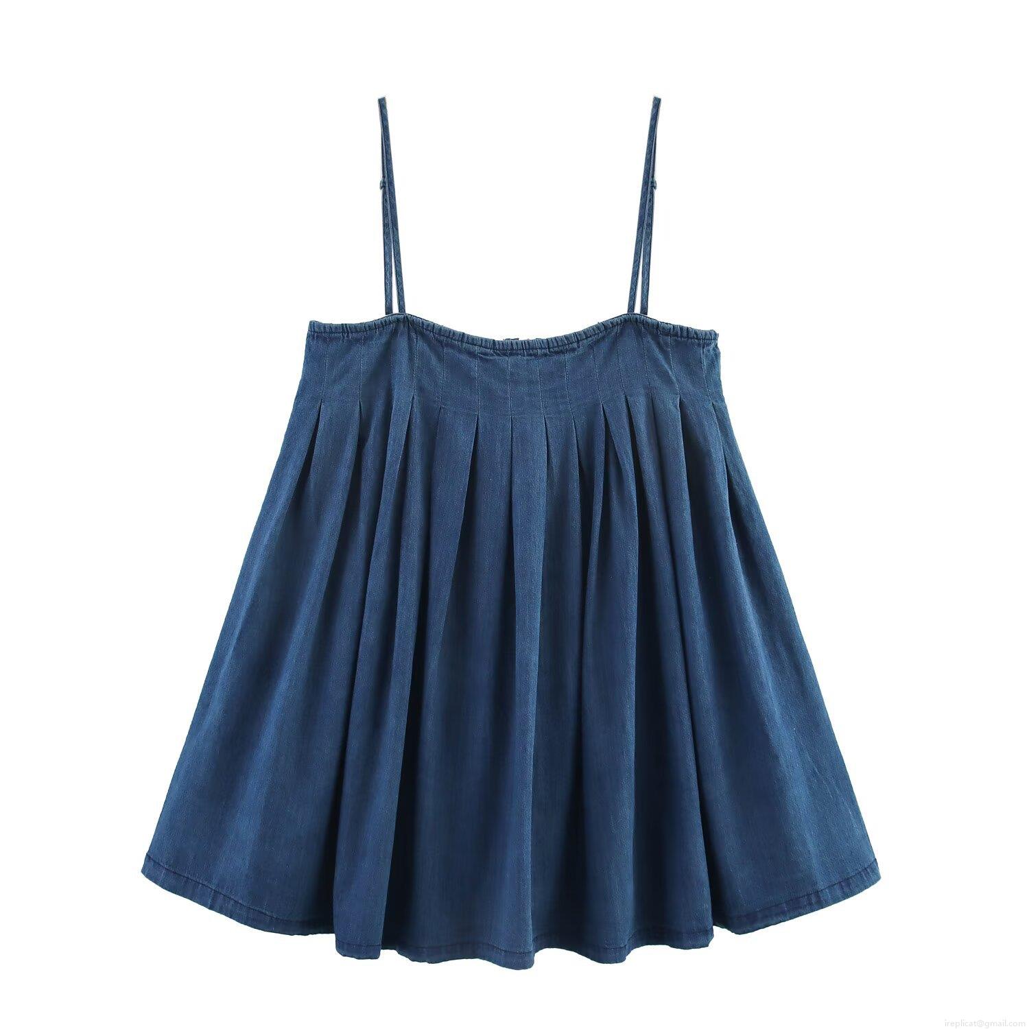 Solid Color, Denim Elements, Pleated Decoration, Thin Shoulder Straps
