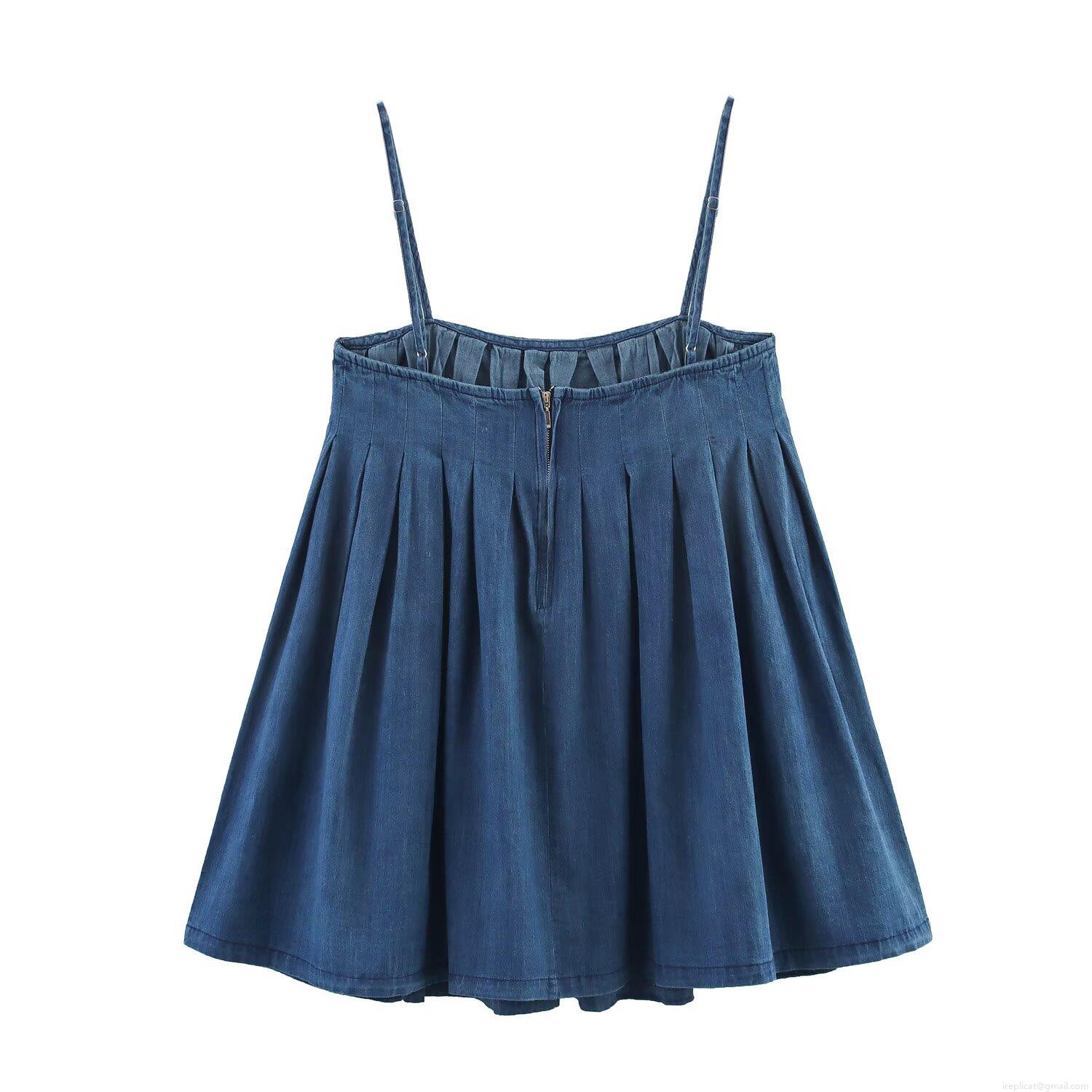 • Women Elegant Denim Spaghetti Strap Mini Dress Sexy Solid Blue Pleated Flare A-Line Dress With Back Zipper For Summer Dating Daily Wear