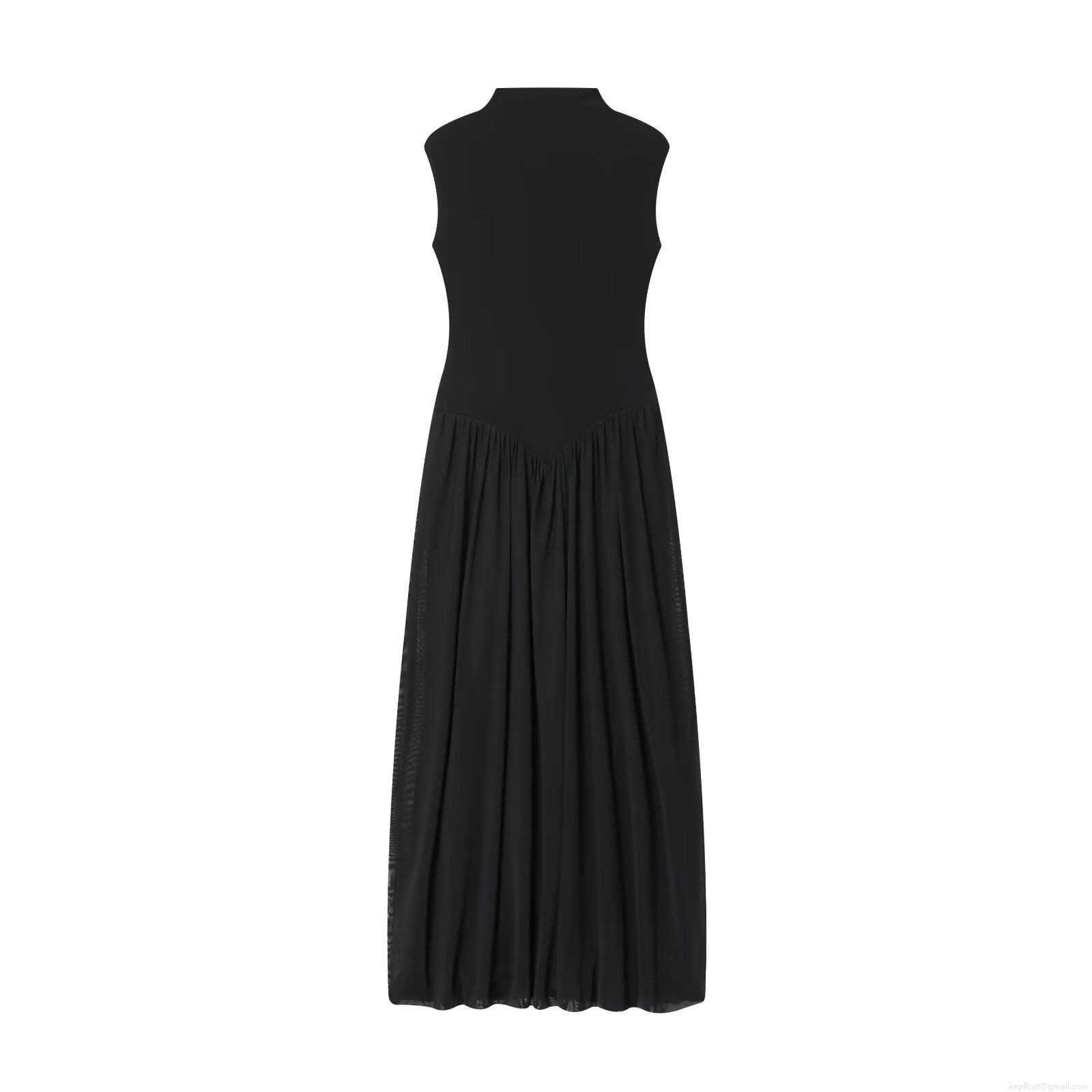 Women Elegant Mesh Patchwork Sleeveless Maxi Dress Semi High Neck Ruffled Tulle Long Dress For Summer Vacation Party Evening Wear