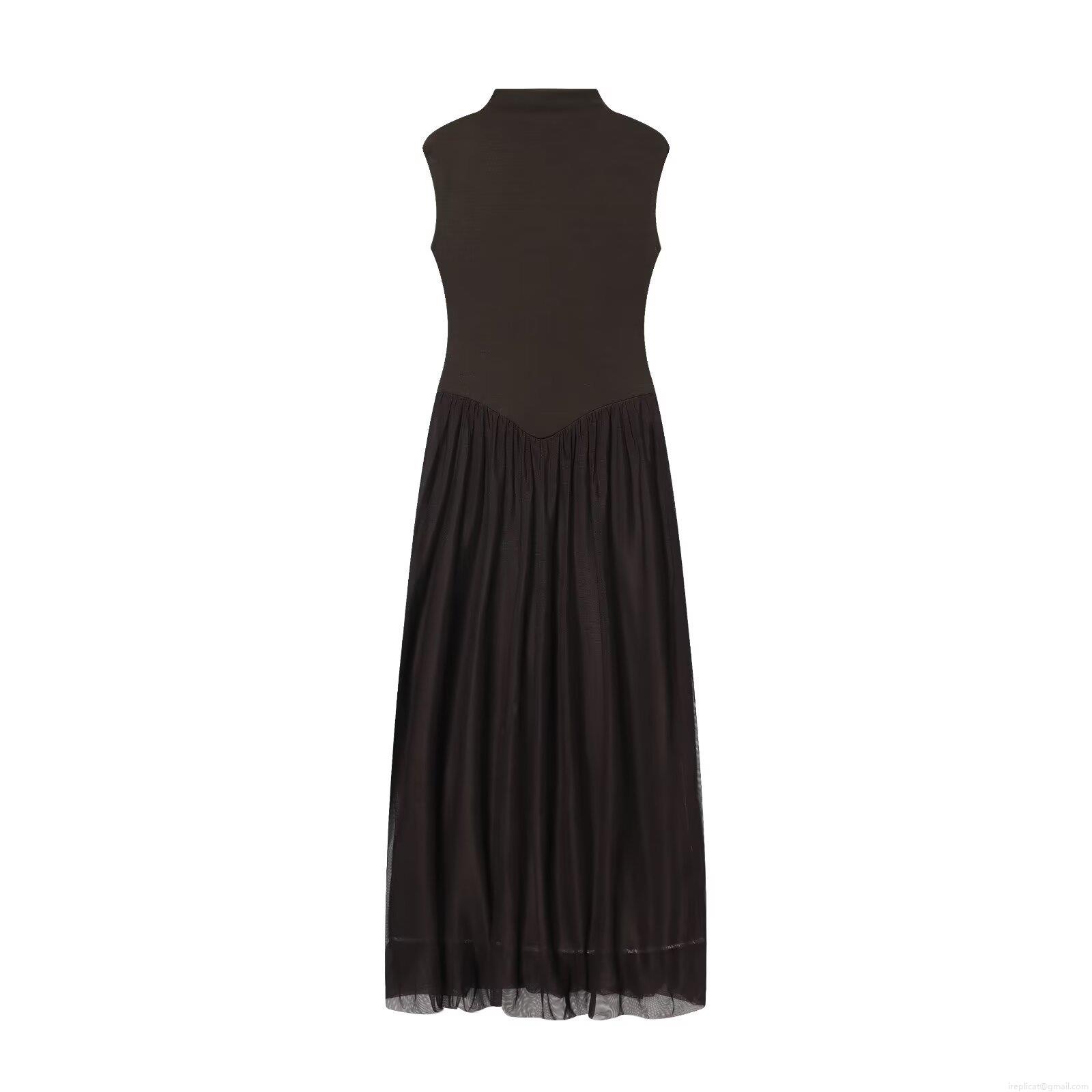 • Women Elegant Mesh Patchwork Sleeveless Maxi Dress Semi High Neck Ruffled Tulle Long Dress For Summer Vacation Party Evening Wear