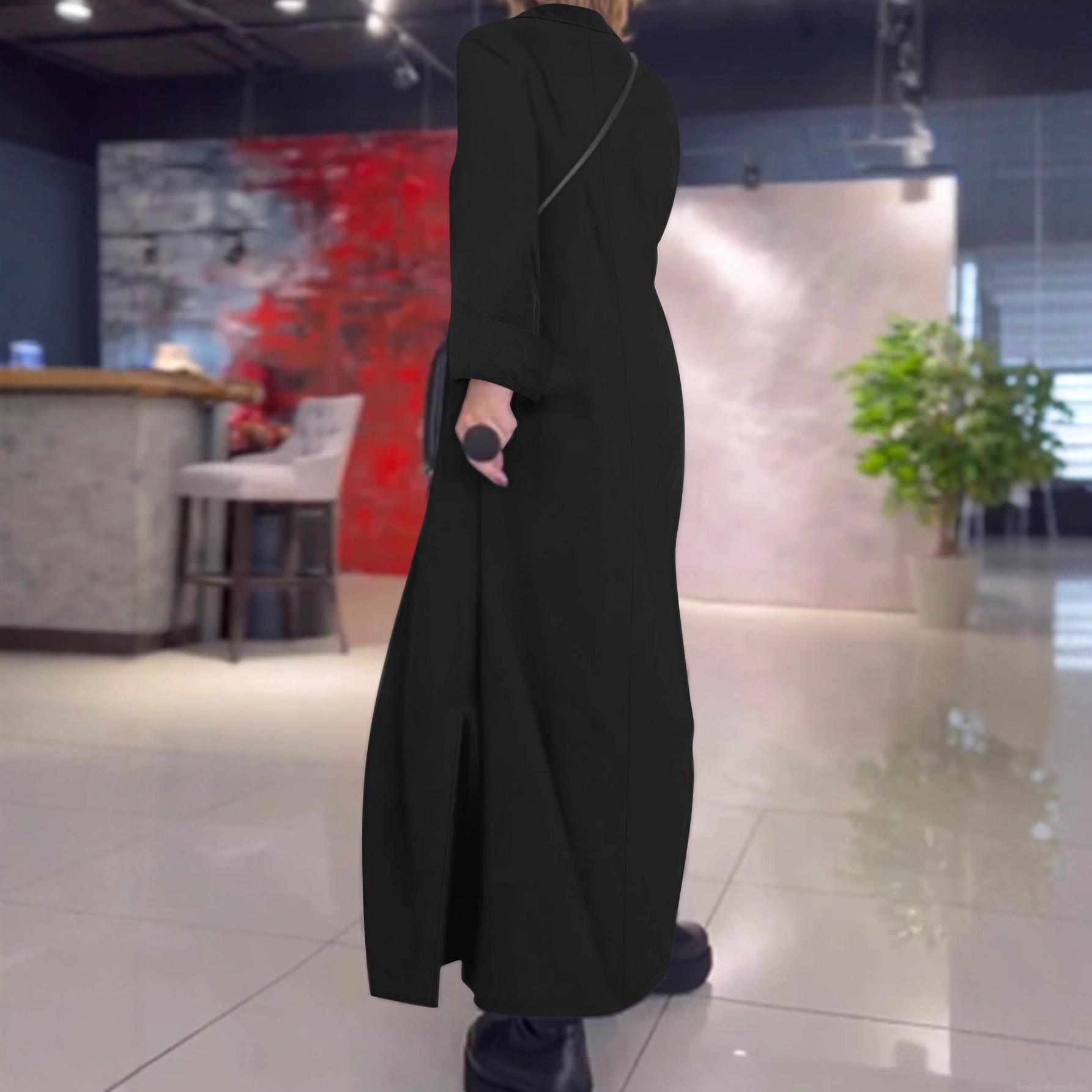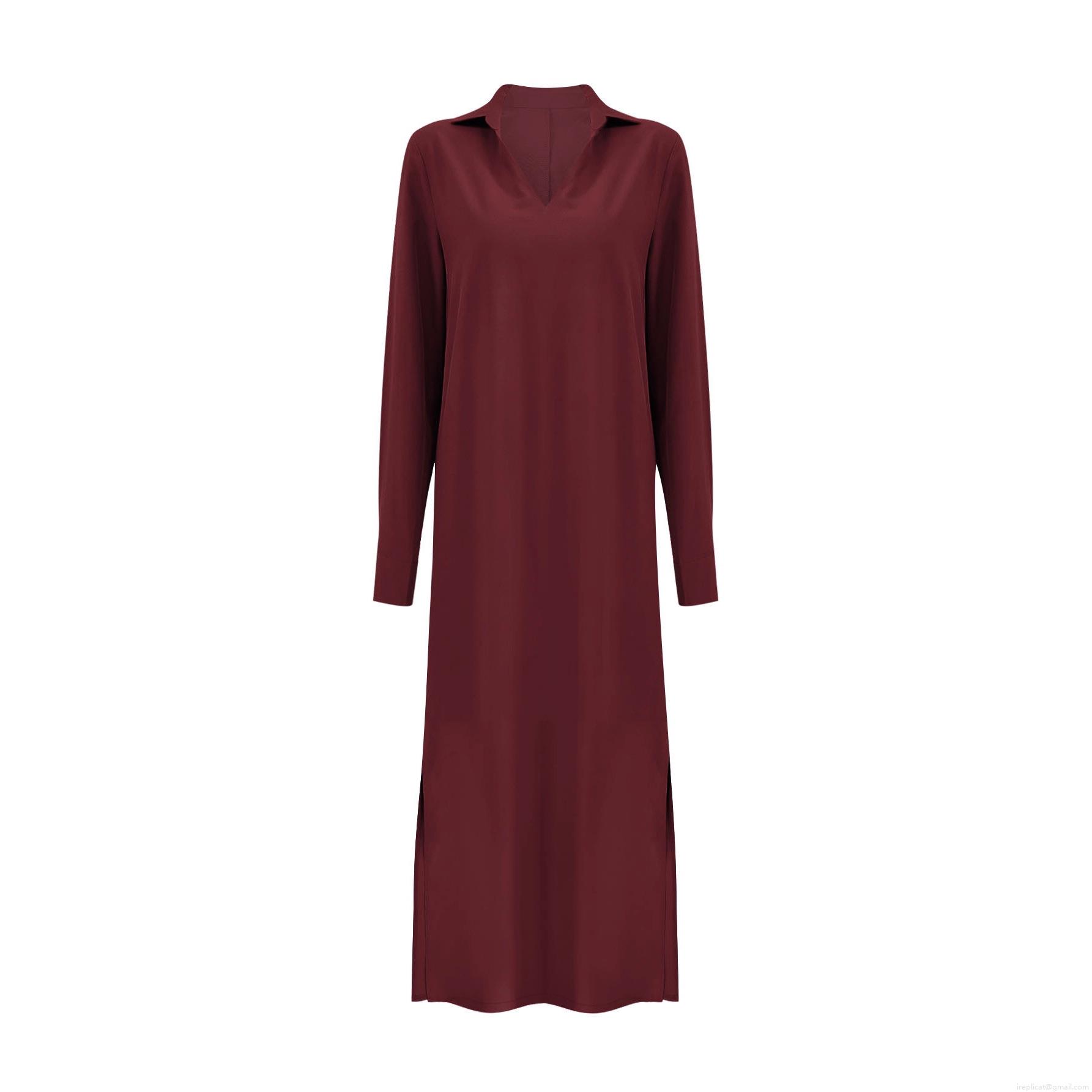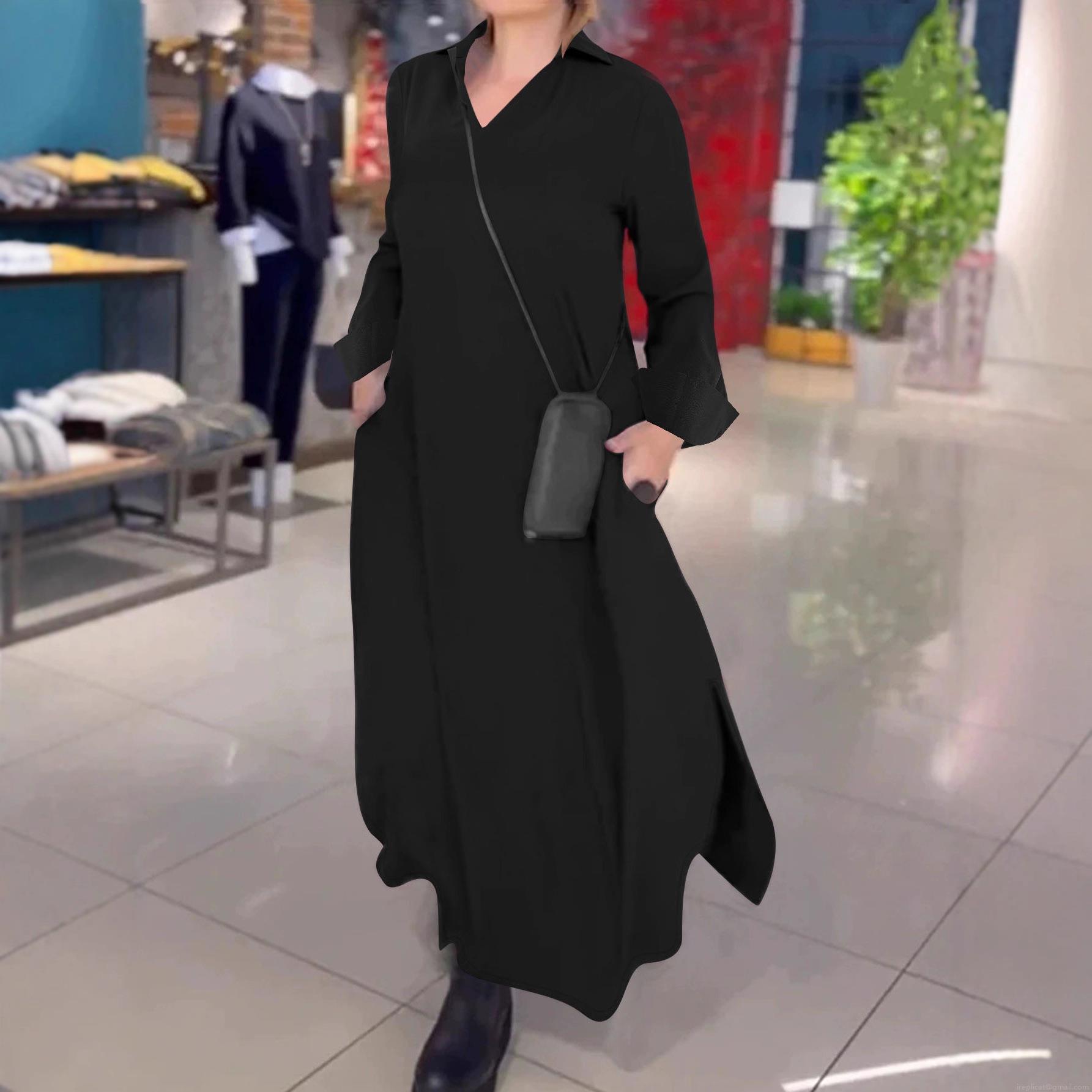 • Women Elegant Plus Size Polyester Solid Color Maxi Dress Autumn Winter Long Sleeve Deep V Neck POLO Collar Pullover Side Slit Long Dress For Casual Commute Party