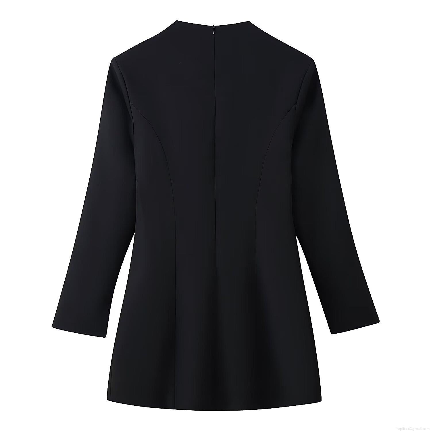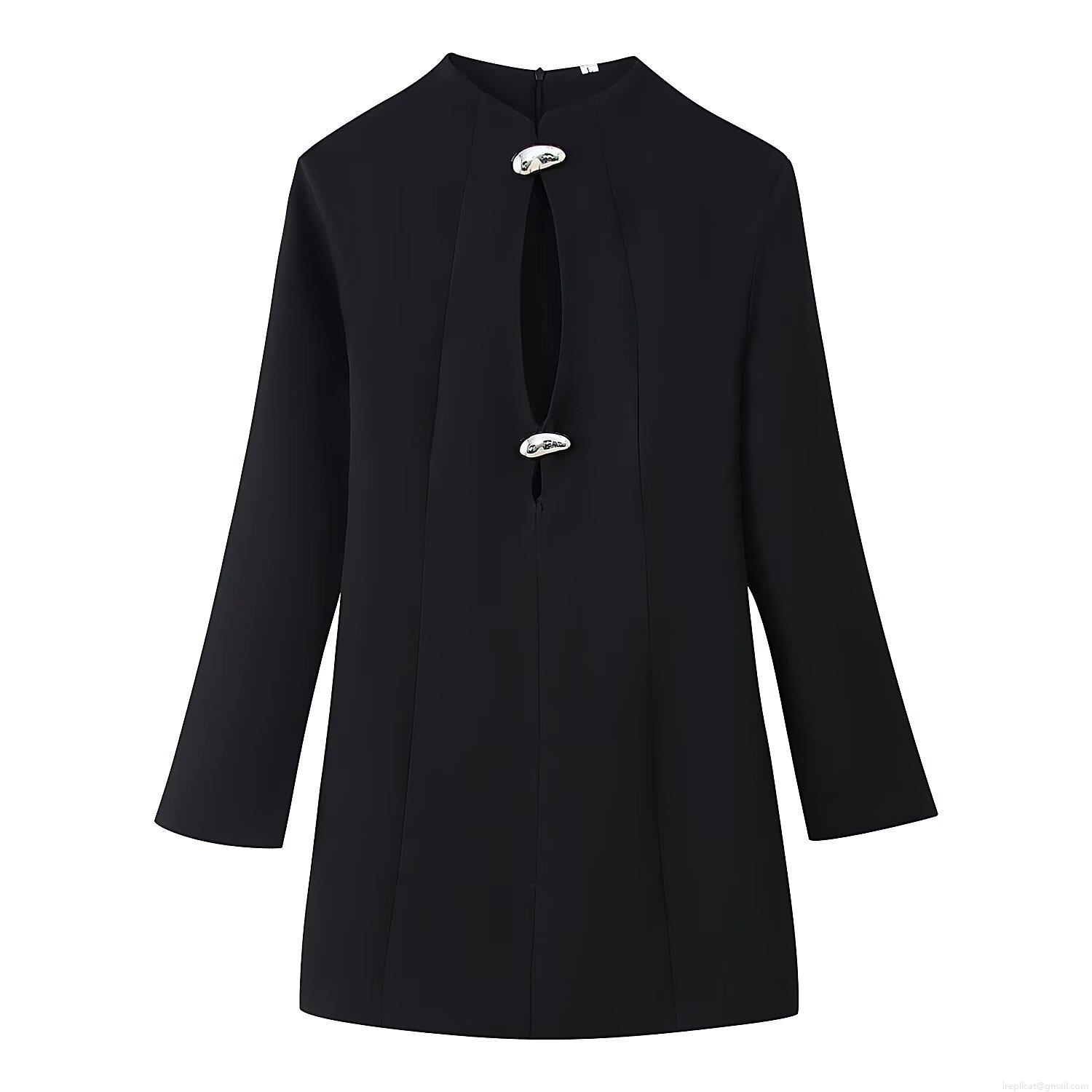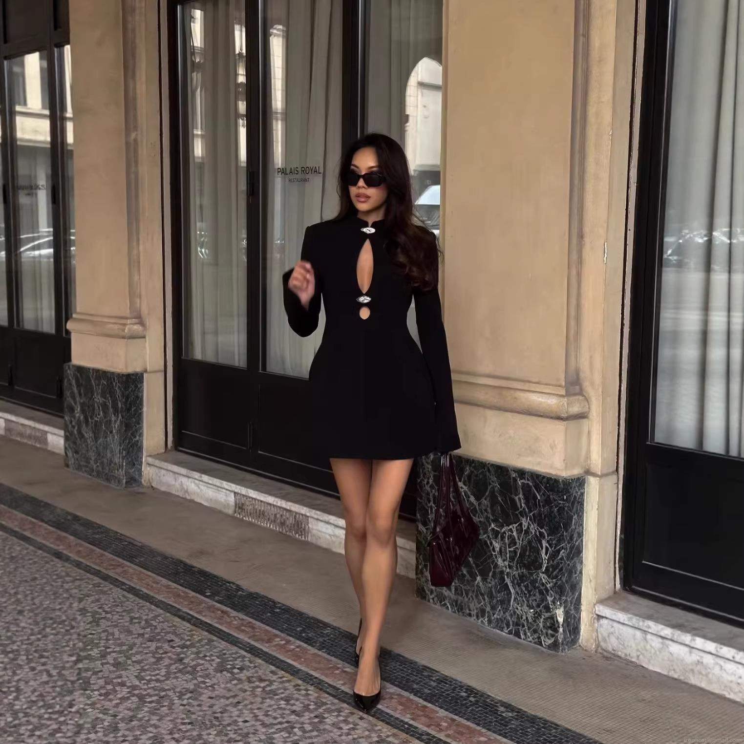 • Women Elegant Polyester Long Sleeve Mini Dress Slim Fit Hollow Out Stand Collar Evening Party Dress With Silver Metal Buckles