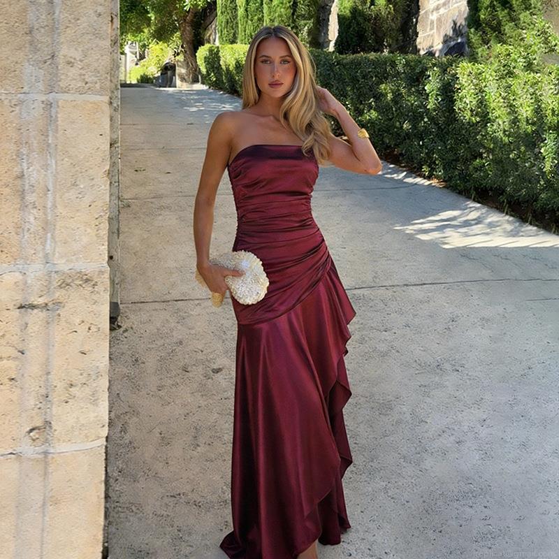 Women Elegant Strapless Ruched Satin Maxi Dress Sexy High Split Ruffle Hem Evening Party Wedding Banquet Socialite Sleeveless Long Dress