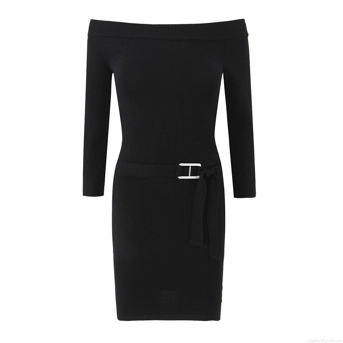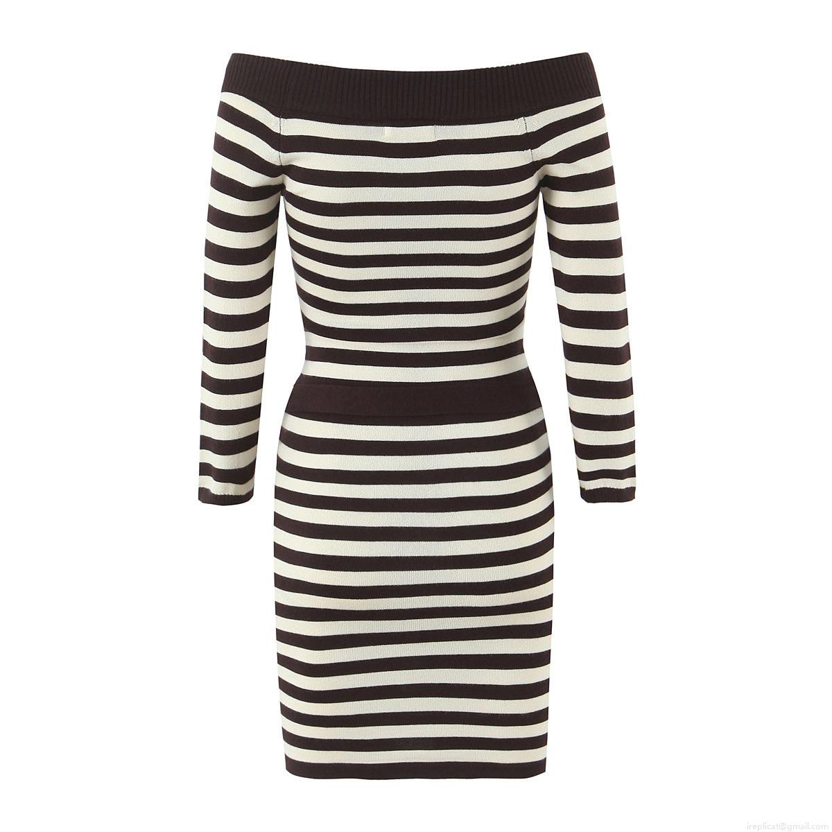 • Women Off-Shoulder Knitted Bodycon Mini Dress Long Sleeve Contrast Striped Elegant Slim Fit Streetwear Dress With H-Buckle Belt