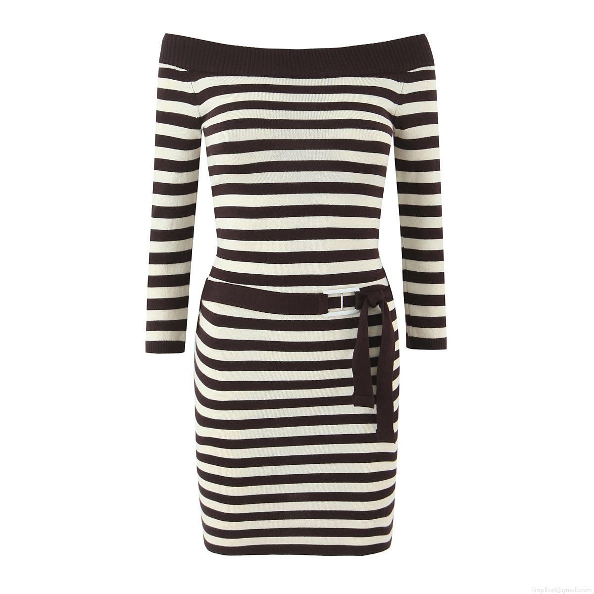 Stripe, Color Blocking, Belt Decoration, Off-shoulder, H Buckle