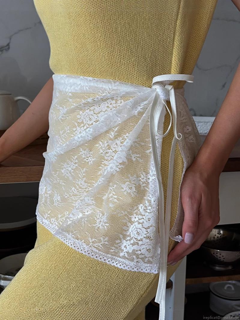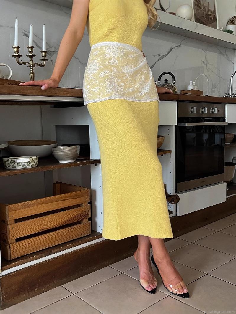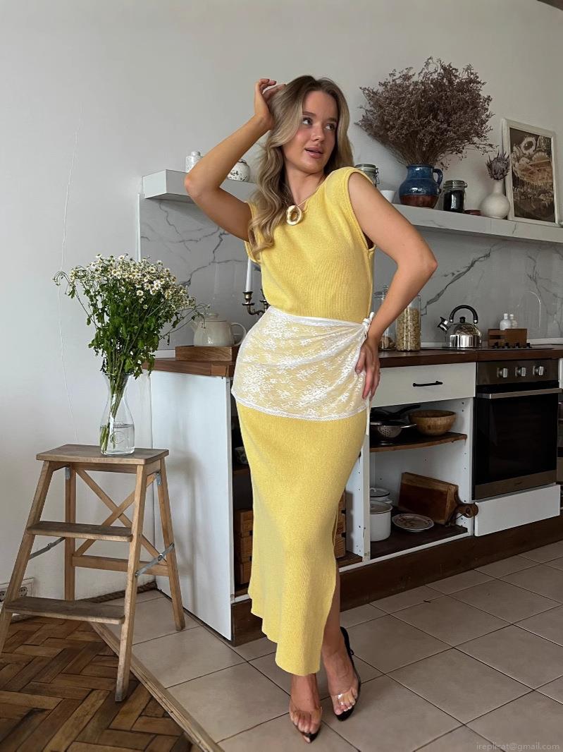 • Women Sexy Backless Sleeveless Knitted Midi Dress With White Lace Waist Decor Summer Fashion Slim Fit Yellow Solid Knitted Tank Dress For Party Dating