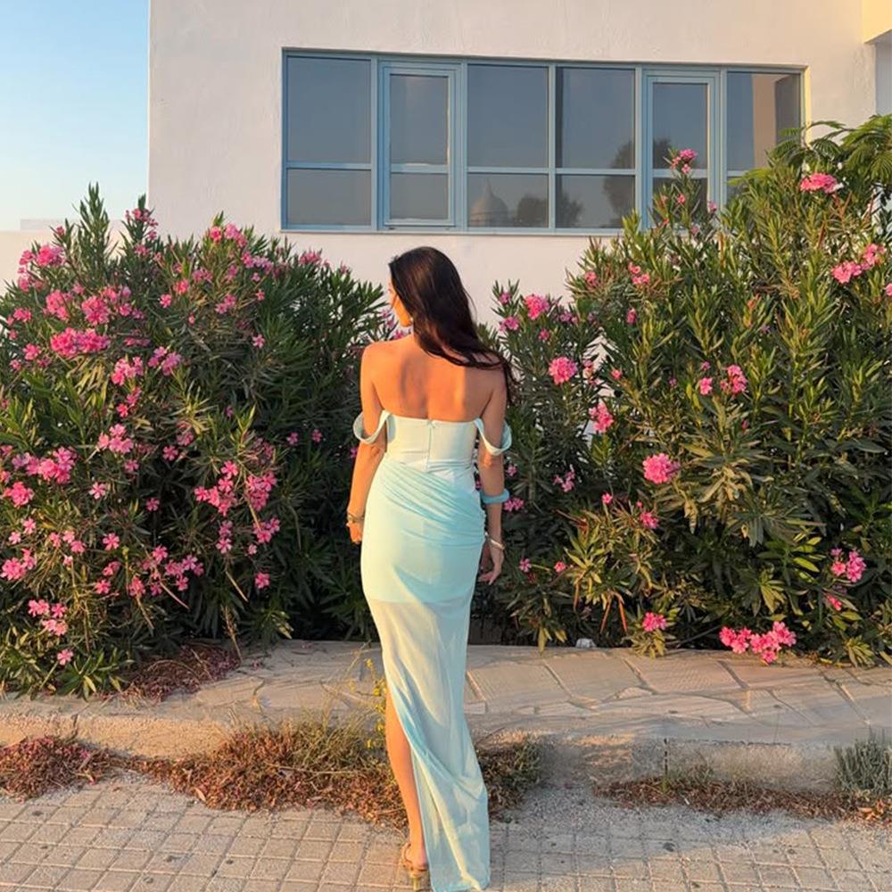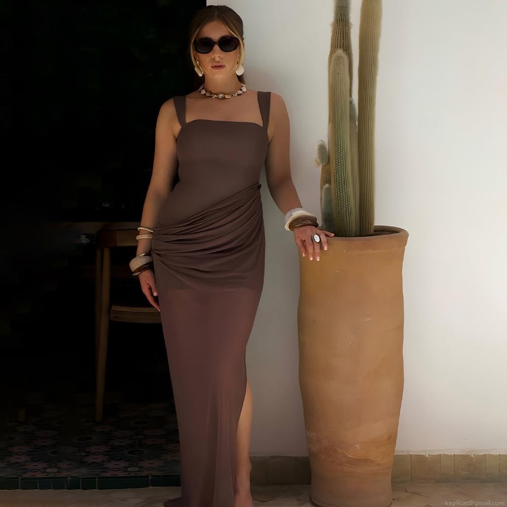 • Women Sexy Backless Slip Maxi Dress Square Neck Pleated Mesh Patchwork High Slit Long Dress For Summer Party Vacation Clubwear