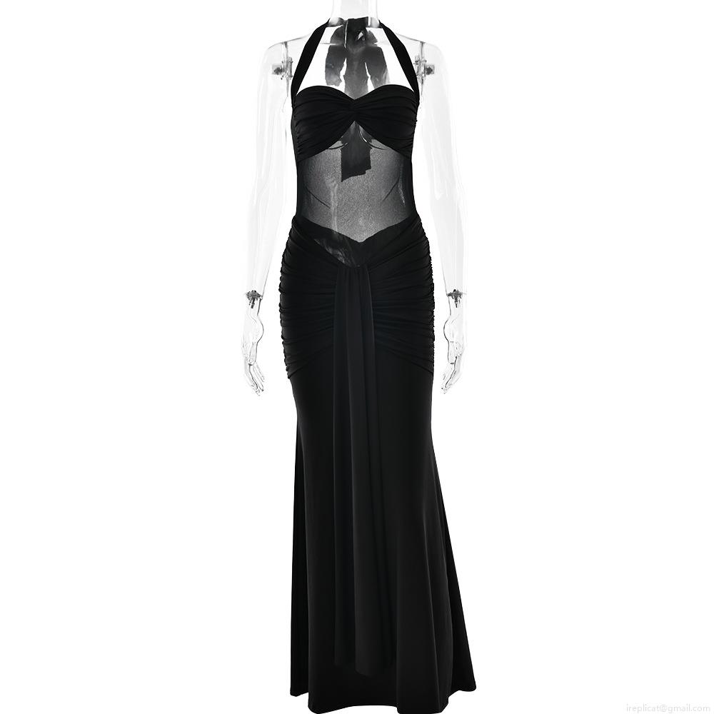 Women Sexy Halter Neck Backless Maxi Dress Polyester Mesh Stitching Ruched Bodycon Evening Party Long Dress Solid Color Sleeveless Clubwear