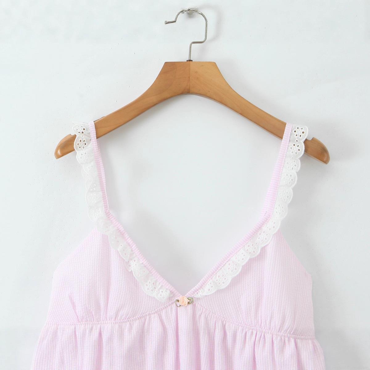 • Women Sexy Lace V-Neck Striped Camisole Dress Sleeveless Polyester Cotton Blend Mini Sundress With Ribbon Flower Detail For Summer Vacation Party
