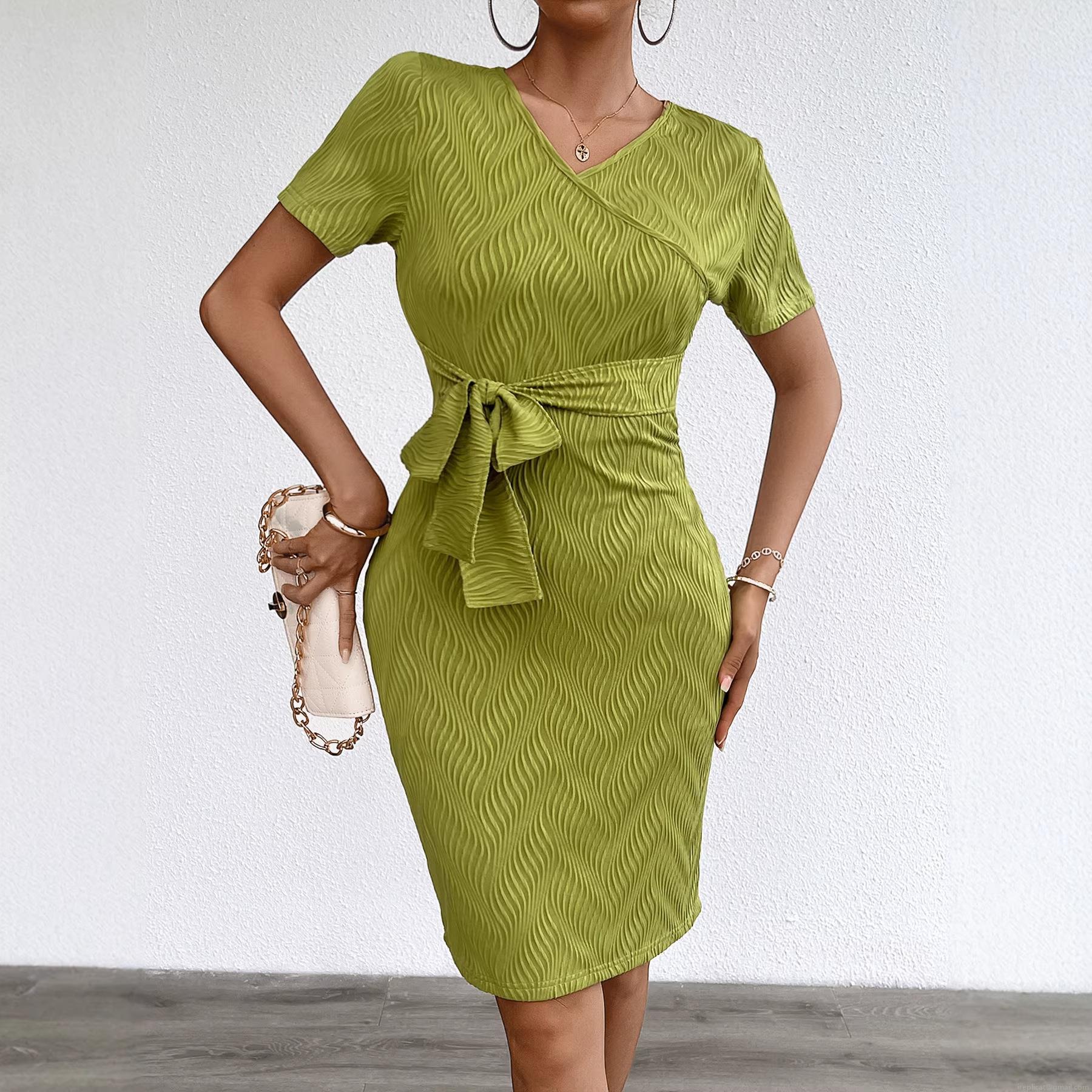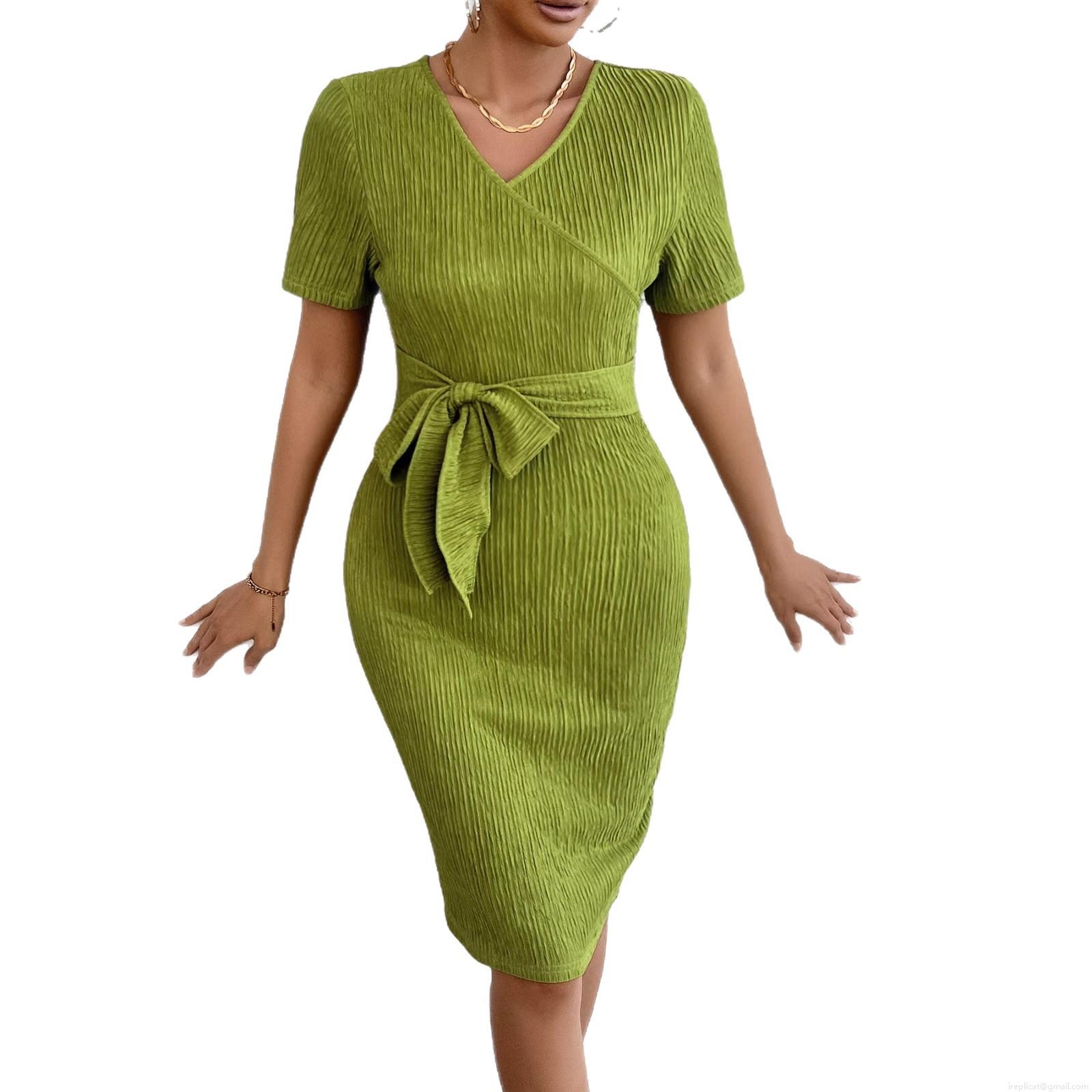 • Women Sexy V Neck Bodycon Midi Dress Short Sleeve Ribbed Knit Wrap Dress With Waist Tie Summer Vacation Party Slim Fit Pencil Dress