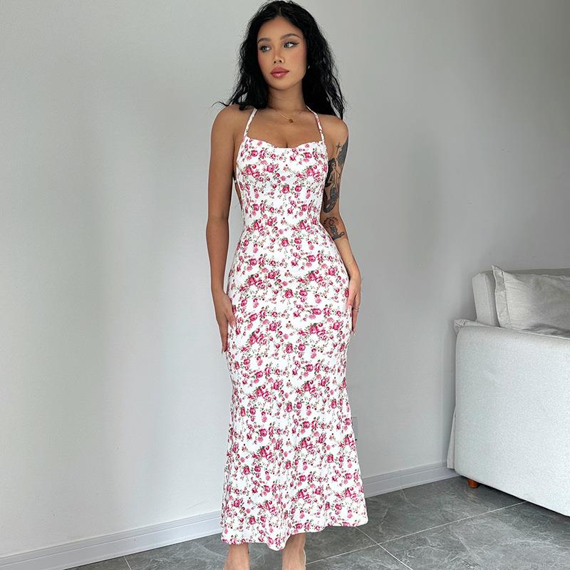 • Women Summer Sexy Floral Print Halter Backless Maxi Dress With High Split Beach Vacation Style Polyester Spandex Sundress For Ladies