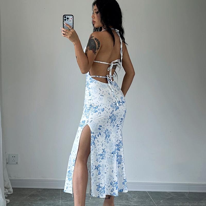 Women Summer Sexy Floral Print Halter Backless Maxi Dress With High Split Beach Vacation Style Polyester Spandex Sundress For Ladies