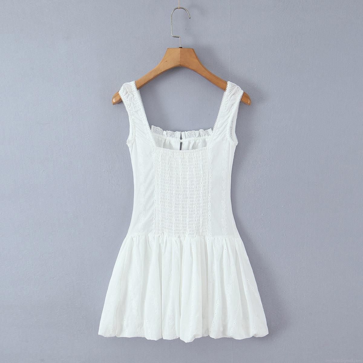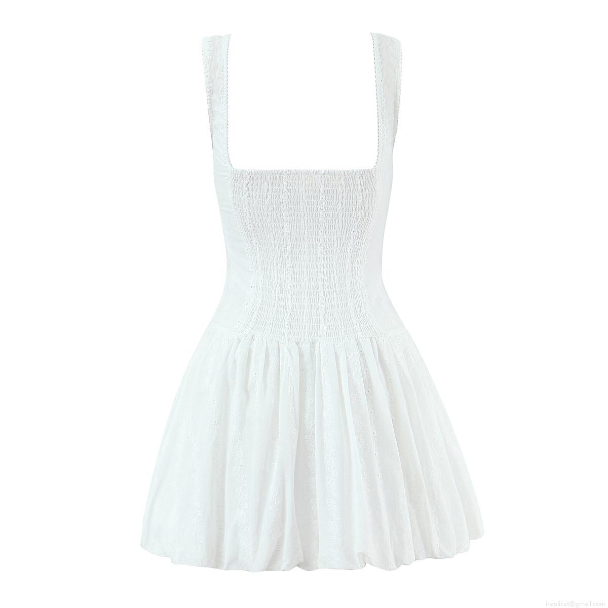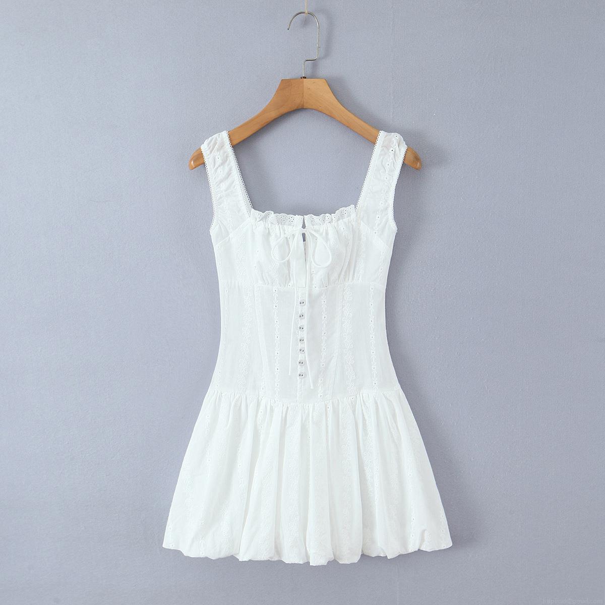 • Women White 100% Cotton Embroidery Lace Mini Dress Sleeveless Camisole Corset Smocked Ruffle A-Line Summer Party Lolita Style Short Sun Dress With Front Buttons