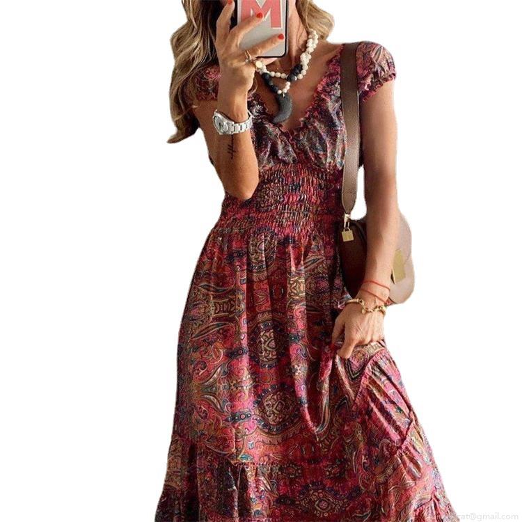 • Women's Bohemian V-Neck Floral Print Maxi Dress Plus Size Vintage Paisley High Waist Tiered Large Hem Short Sleeve Summer Casual Long Dress