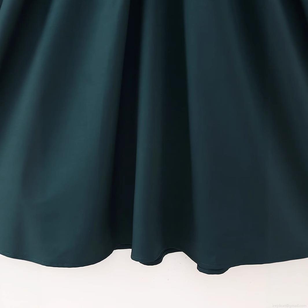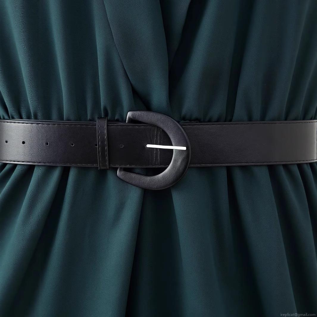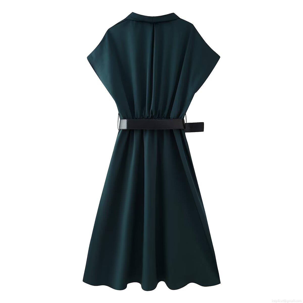 • Women's Elegant Dark Green V-Neck Midi Dress With Black Belt Short Sleeve Solid Color A-Line Evening Party Dress For Women Office Lady Fashion