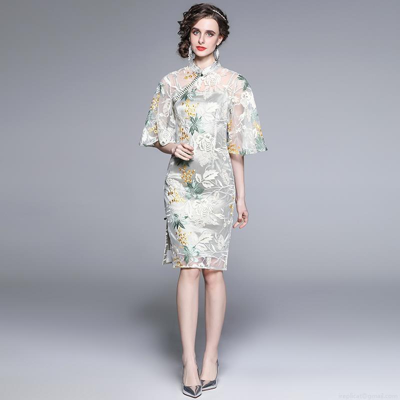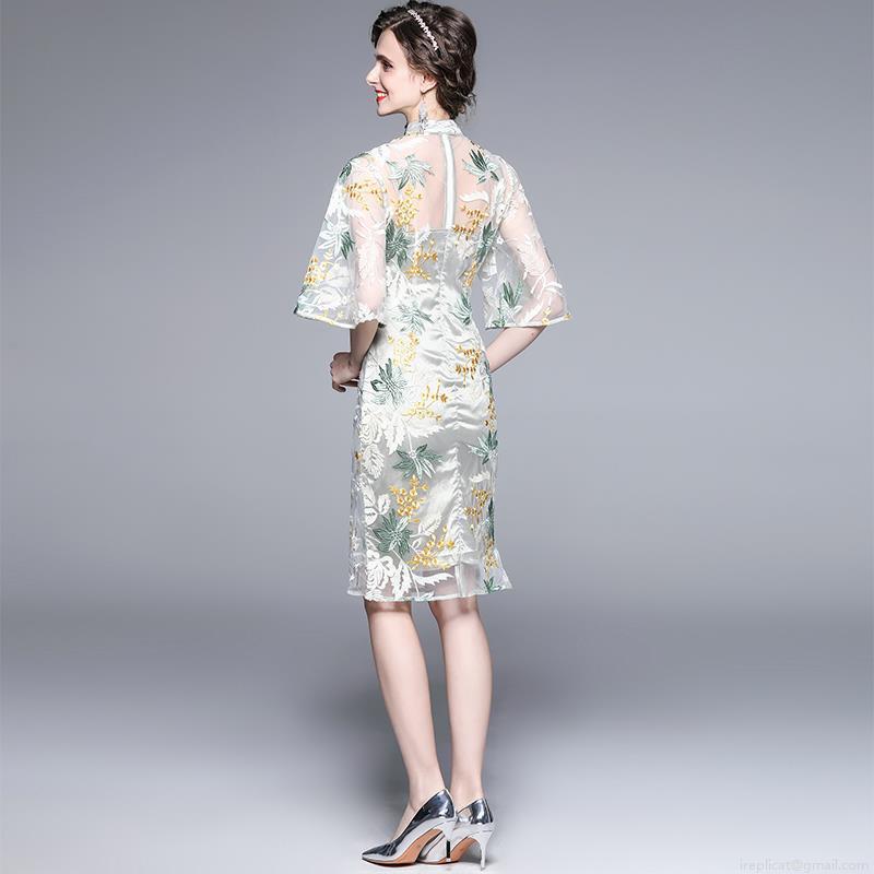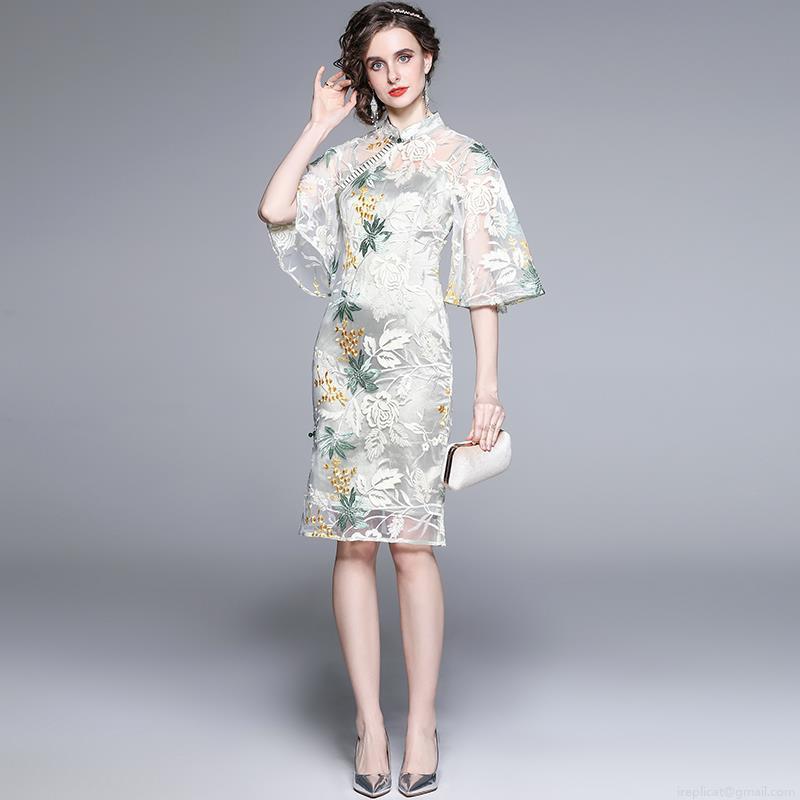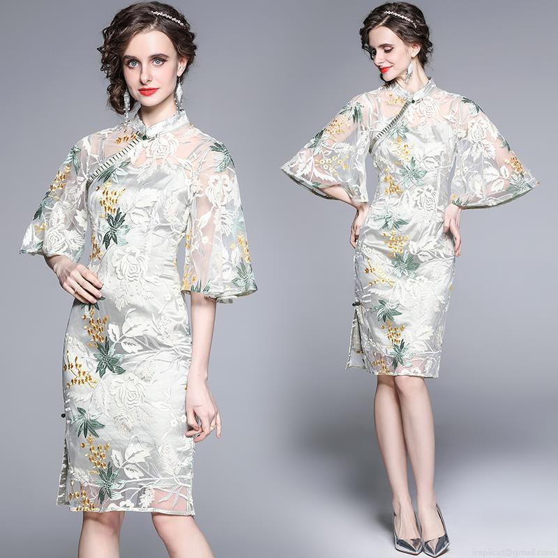 Women's Elegant Improved Qipao Dress Vintage Floral Embroidery Lace Trumpet Sleeve Midi Dress Chinese Style Party Evening Gown Women Clothing