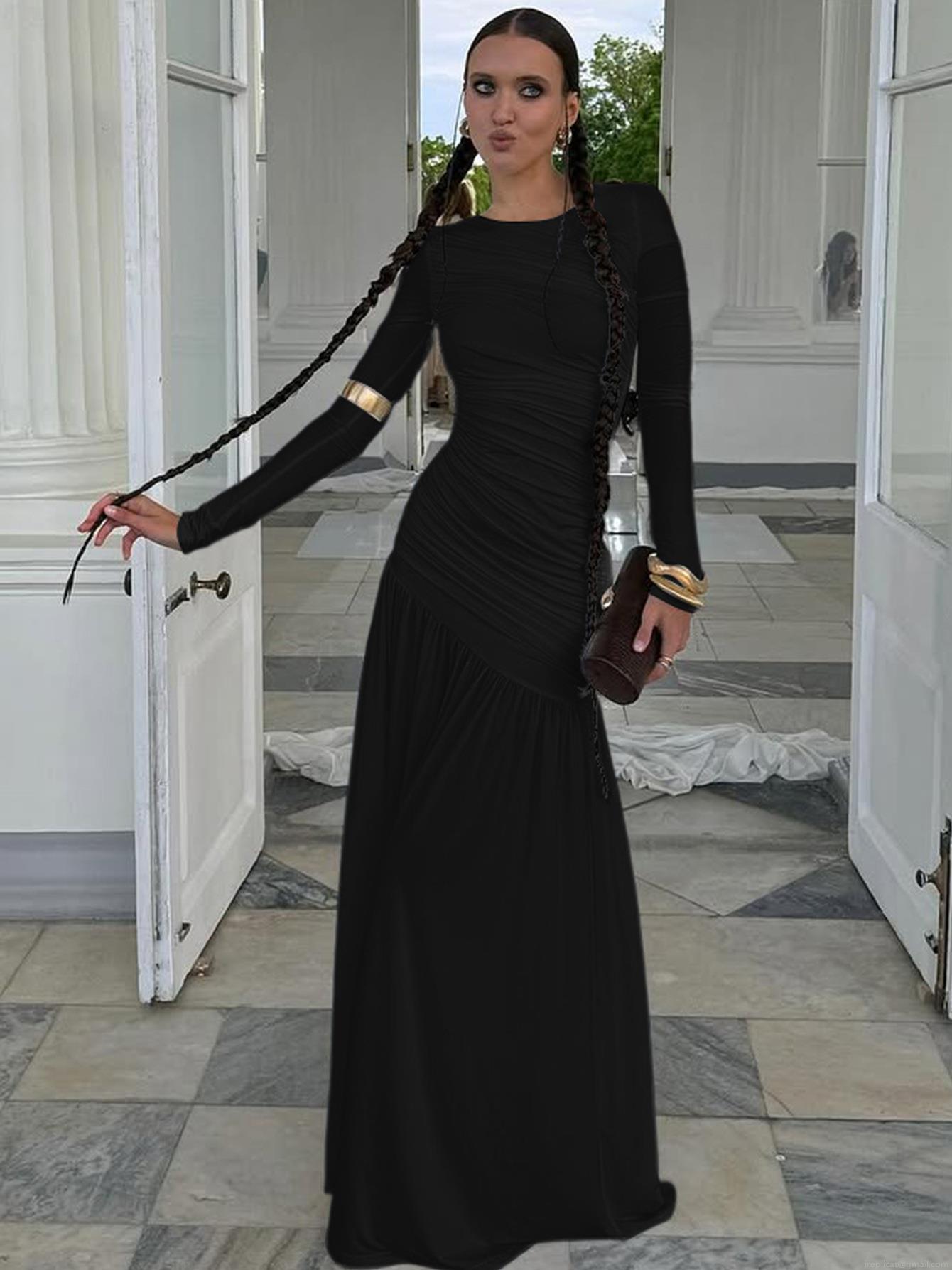 • Women's Elegant Ruched Slim Fit Round Neck Maxi Dress Long Sleeve Polyester Spandex Floor Length Bodycon Party Evening Formal Dress