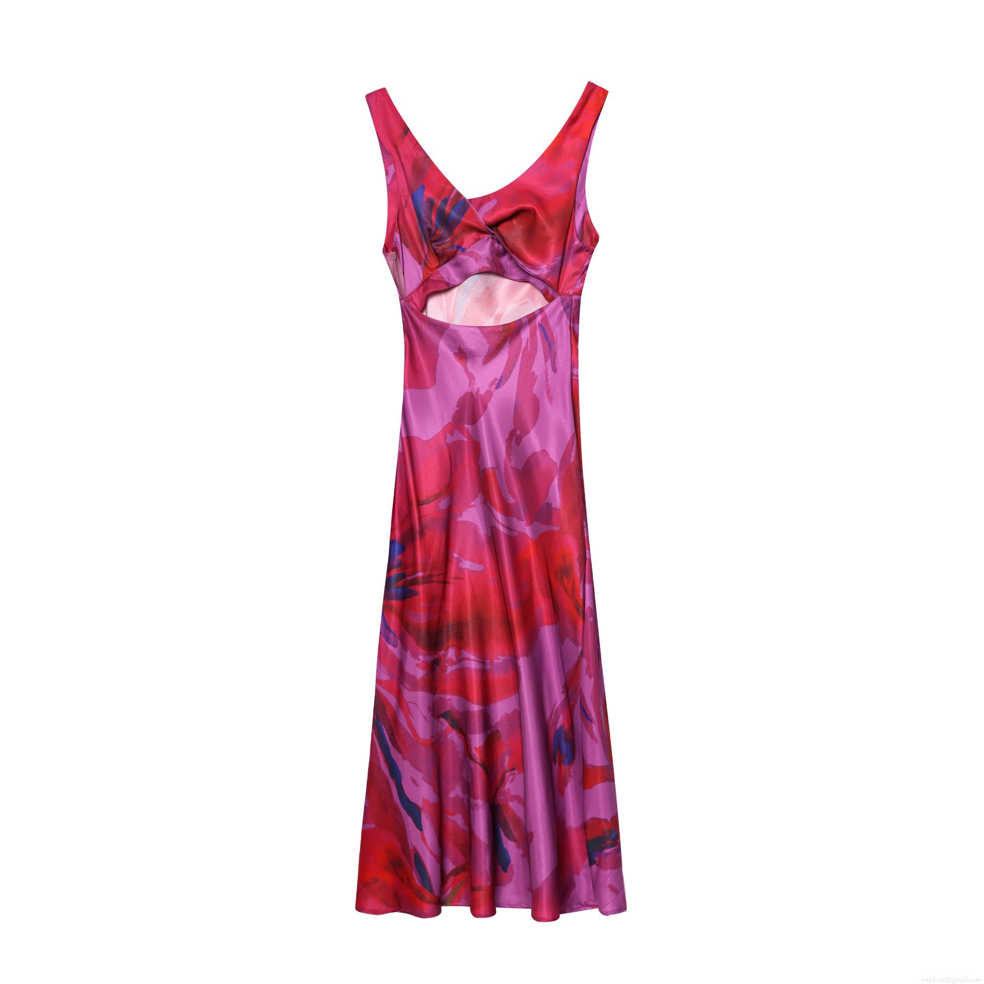 Women's Elegant V-Neck Satin Midi Dress Abstract Floral Print Sleeveless Cut-Out Waist Sexy Evening Party Dresses For Summer Vacation