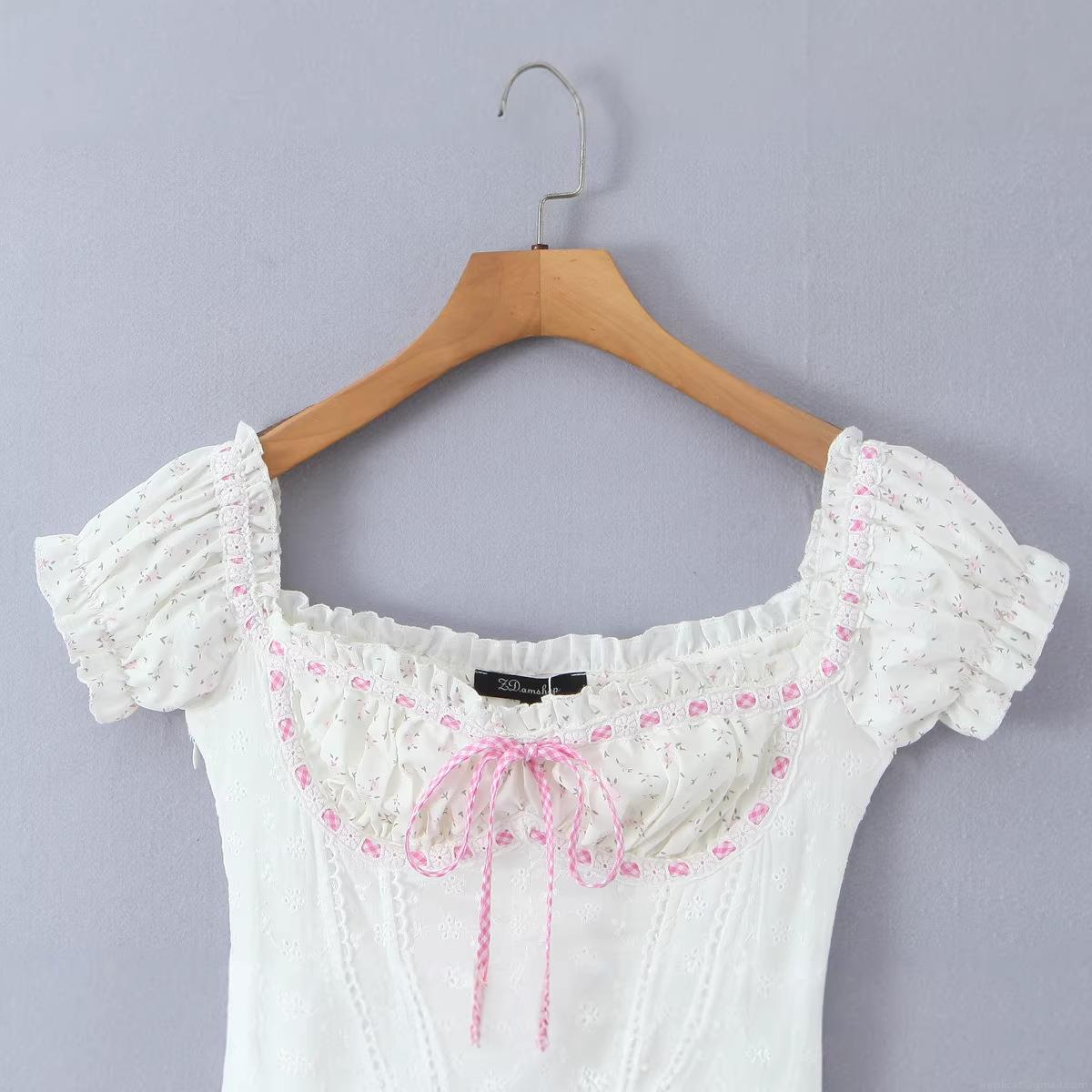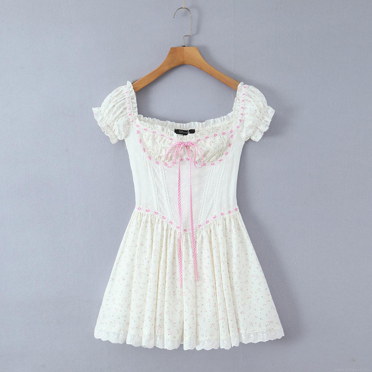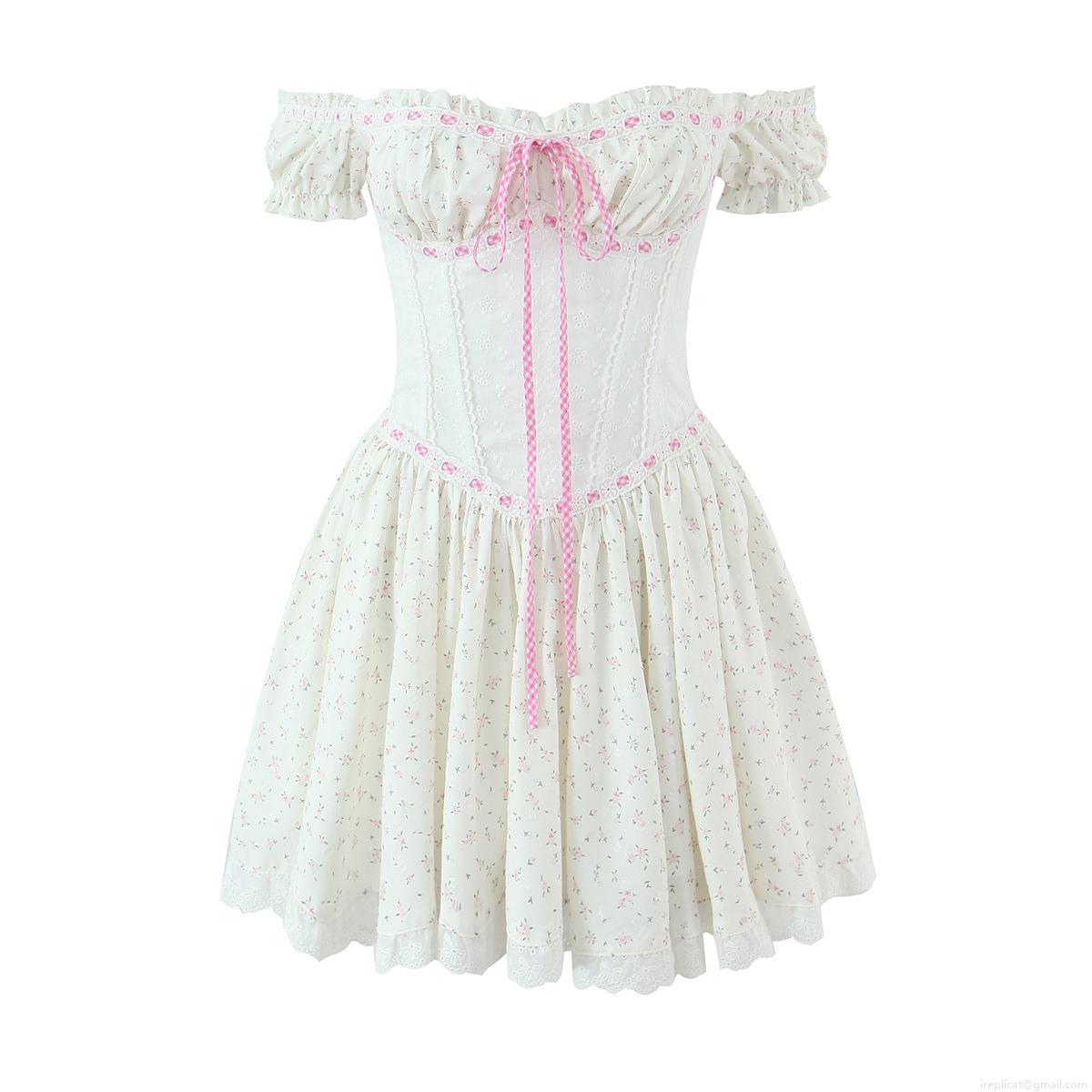 • Women's French Retro Floral Mini Dress Polyester Off-Shoulder Puff Sleeve Lace Trim Corset Waist Sweet Summer Party Dress For Women