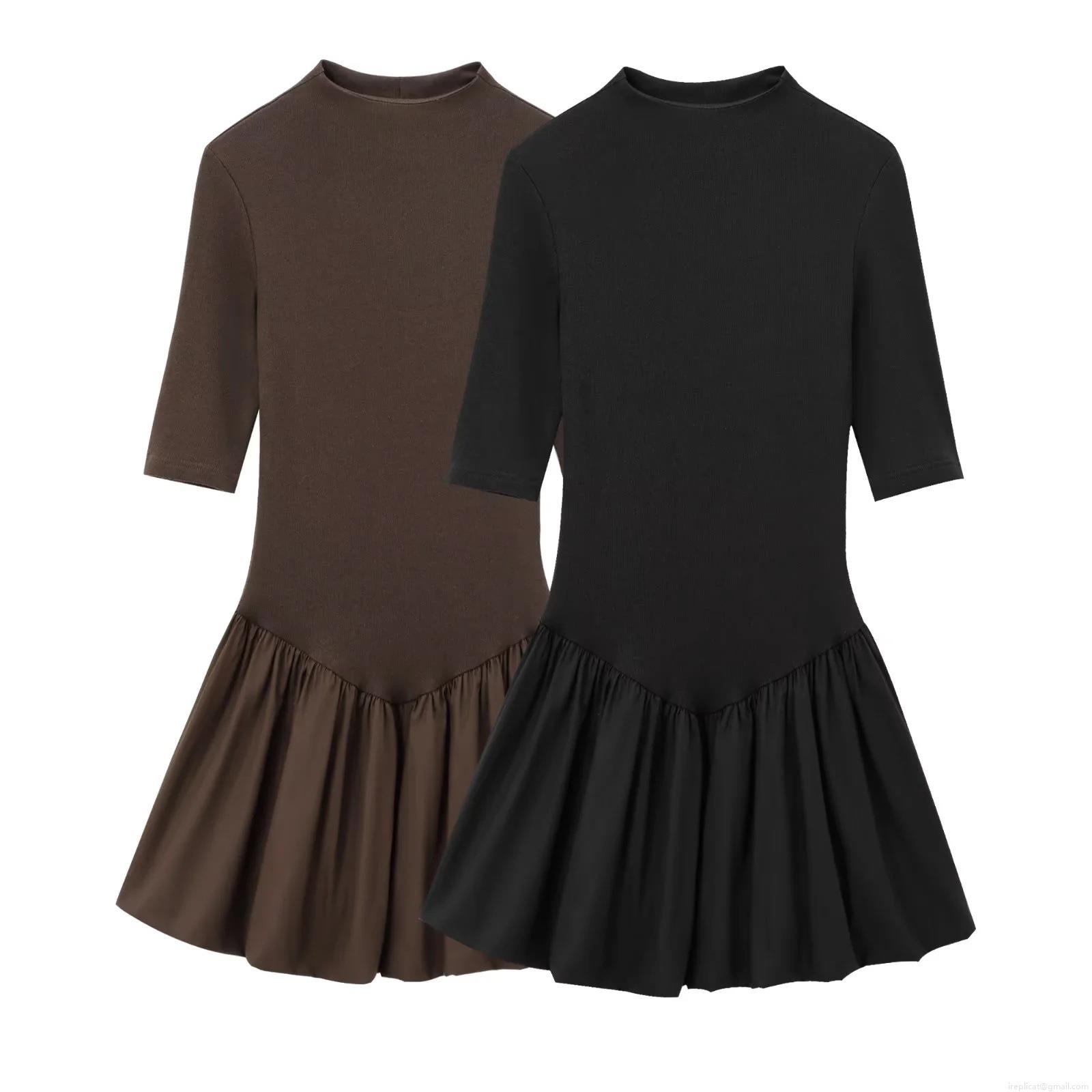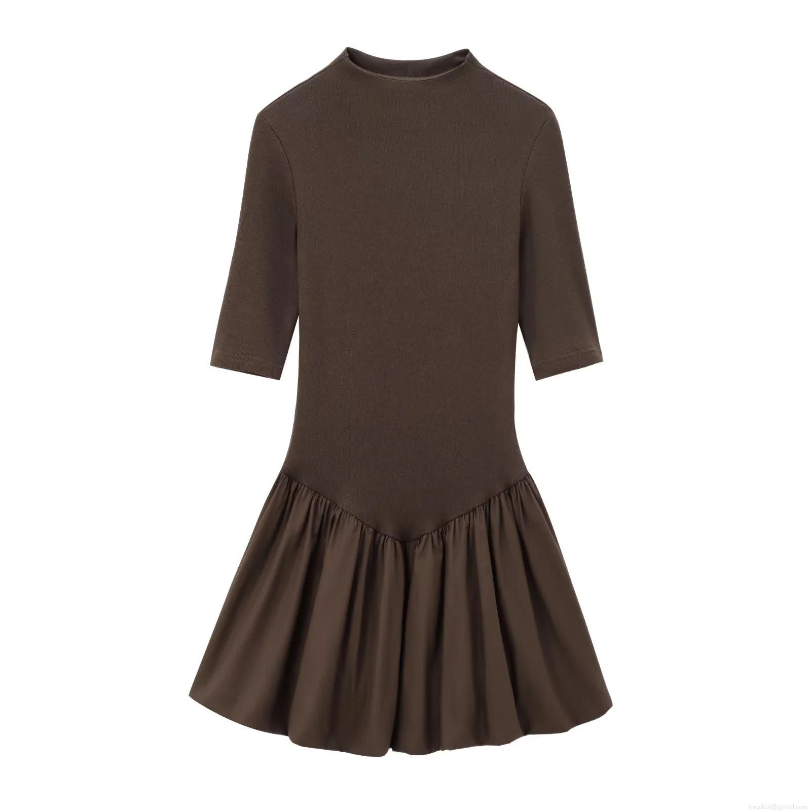 Women's Half High Collar Ribbed Knit Spliced Pleated Mini Dress Solid Color Slim Fit A-Line Half Sleeve Party Elegant Dress