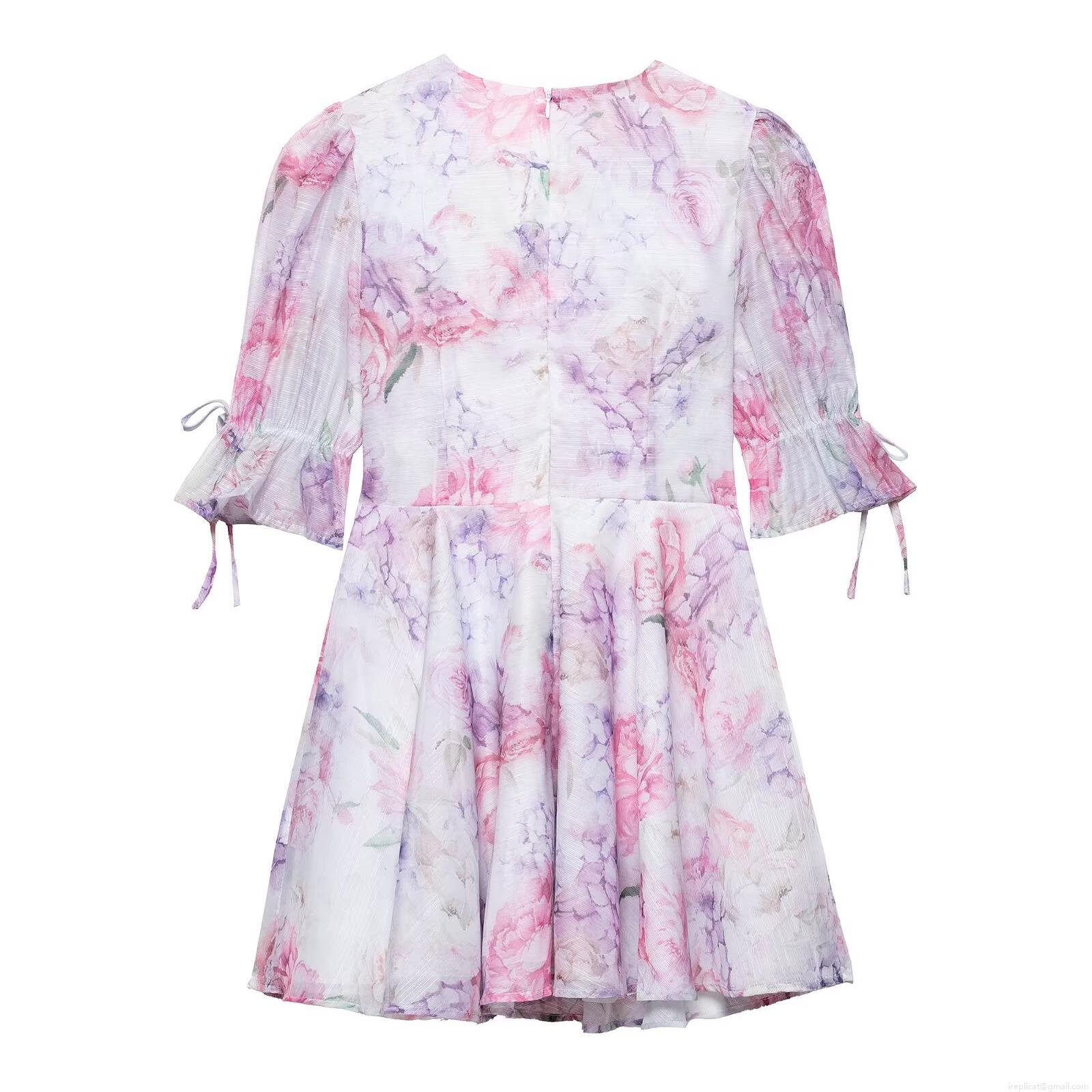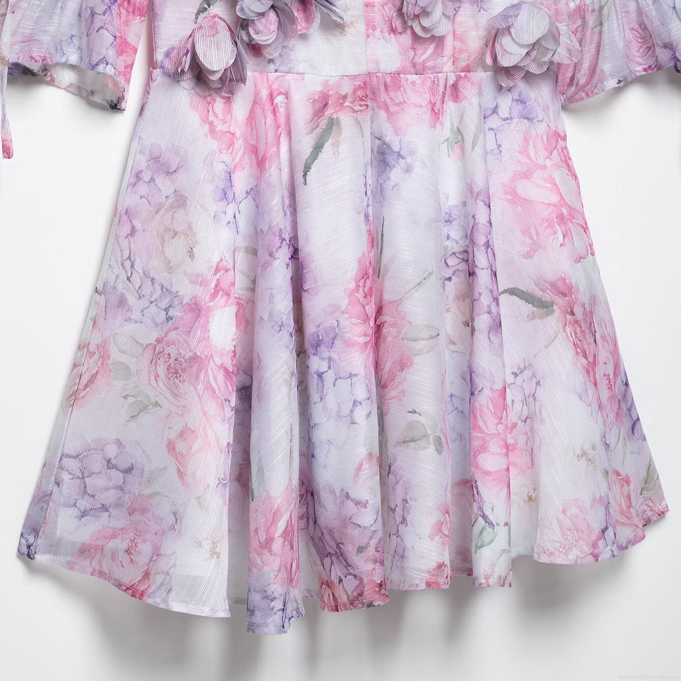 Women's Pink Purple Floral V-Neck Mini Dress With 3D Applique Flowers Backless Short Sleeve Chiffon Party Dress Elegant Summer Skirt