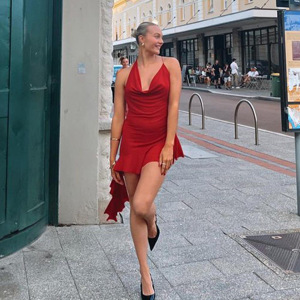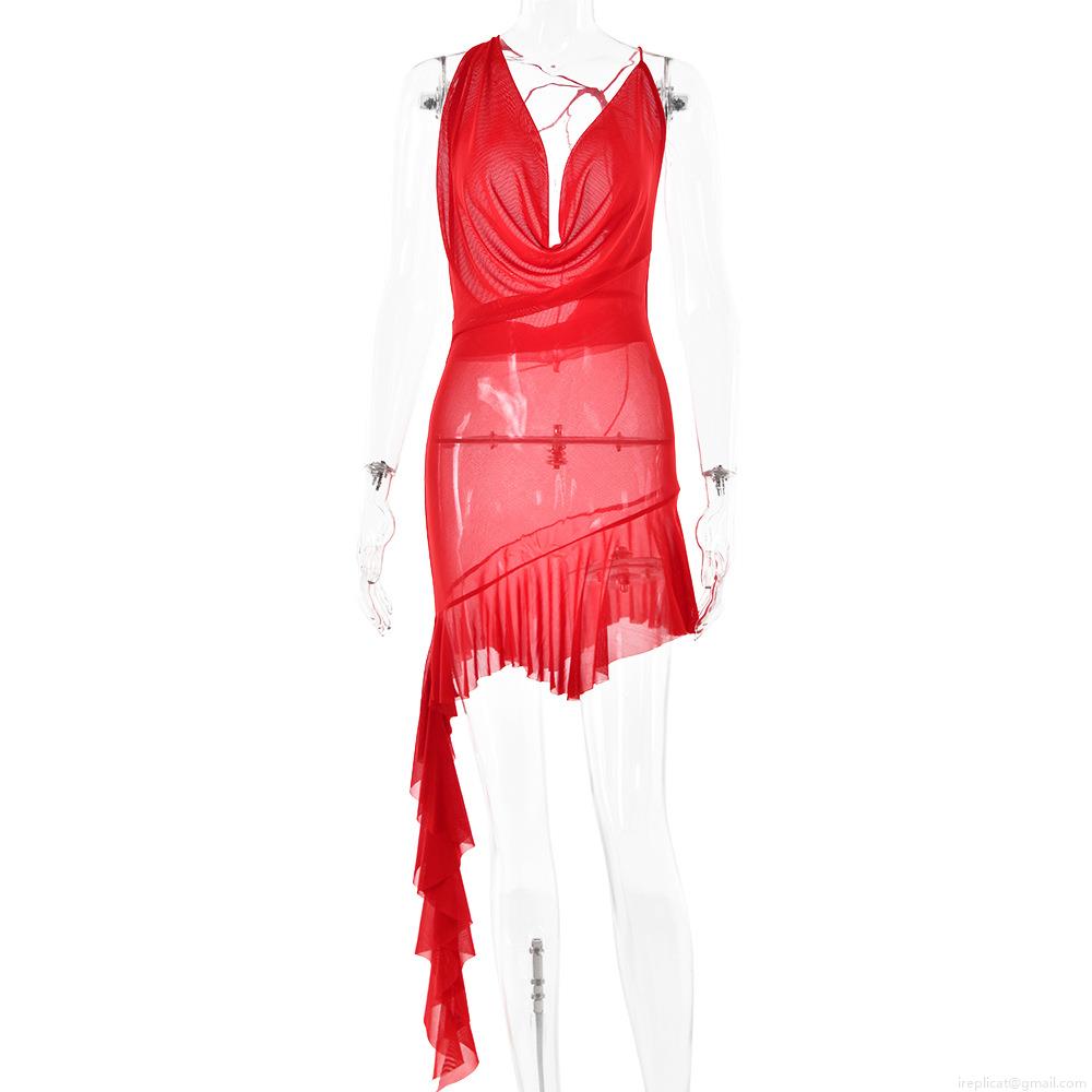 Women's Sexy Backless Cowl Neck Mini Dress Polyester Mesh Halter Ruffle Hem Asymmetric Party Clubwear Sleeveless Solid Color Dress