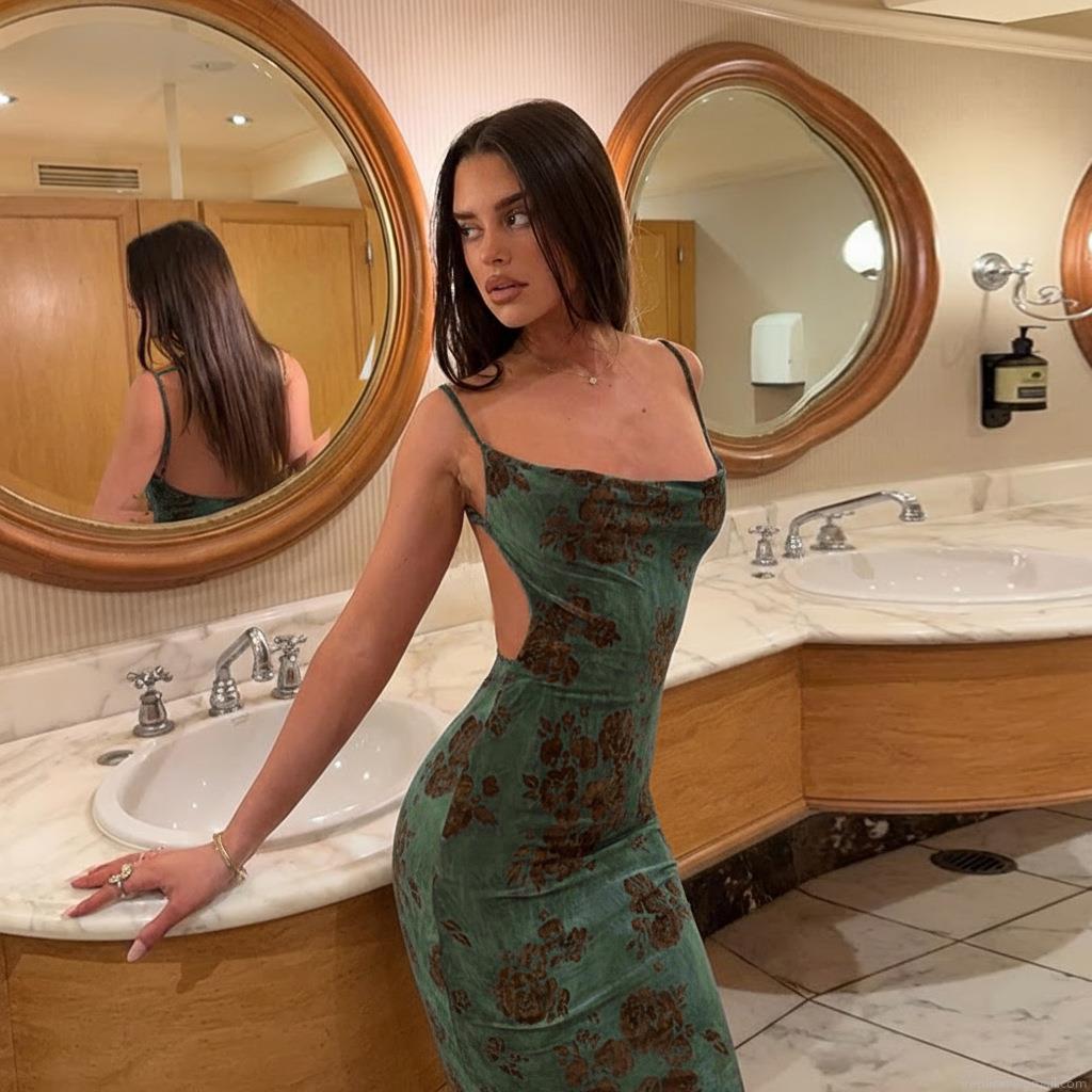 • Women's Sexy Backless Sling Maxi Dress Vintage Brown Floral Print Flocking Polyester Spandex Slim Fit Bodycon Long Dress For Party Club Evening