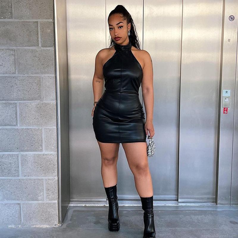 • Women's Sexy Halter Neck PU Leather Bodycon Mini Dress Sleeveless Backless Clubwear Party Evening Chic Slim Fit Short Dress